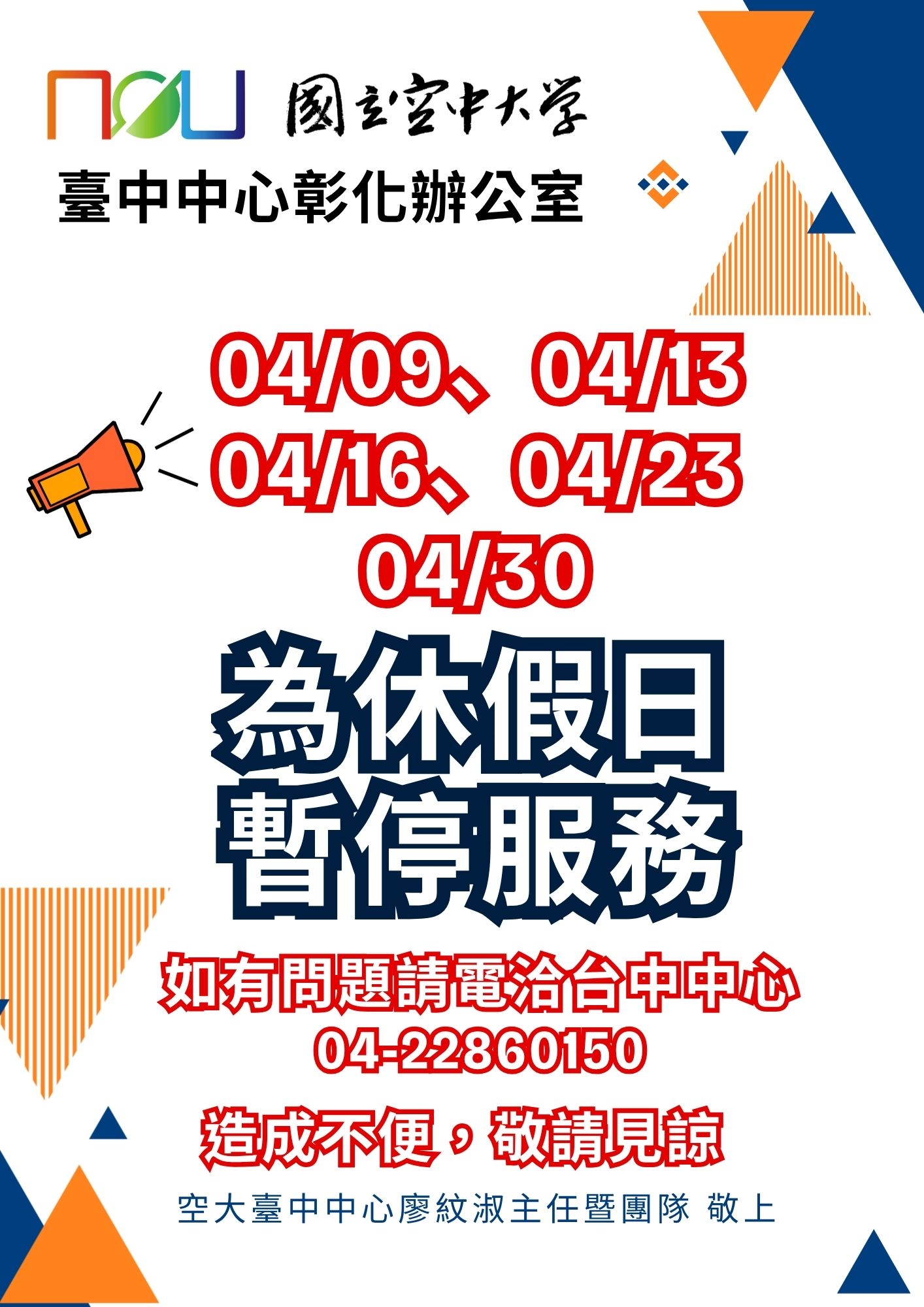 彰化辦公室4月份平日公休公告
