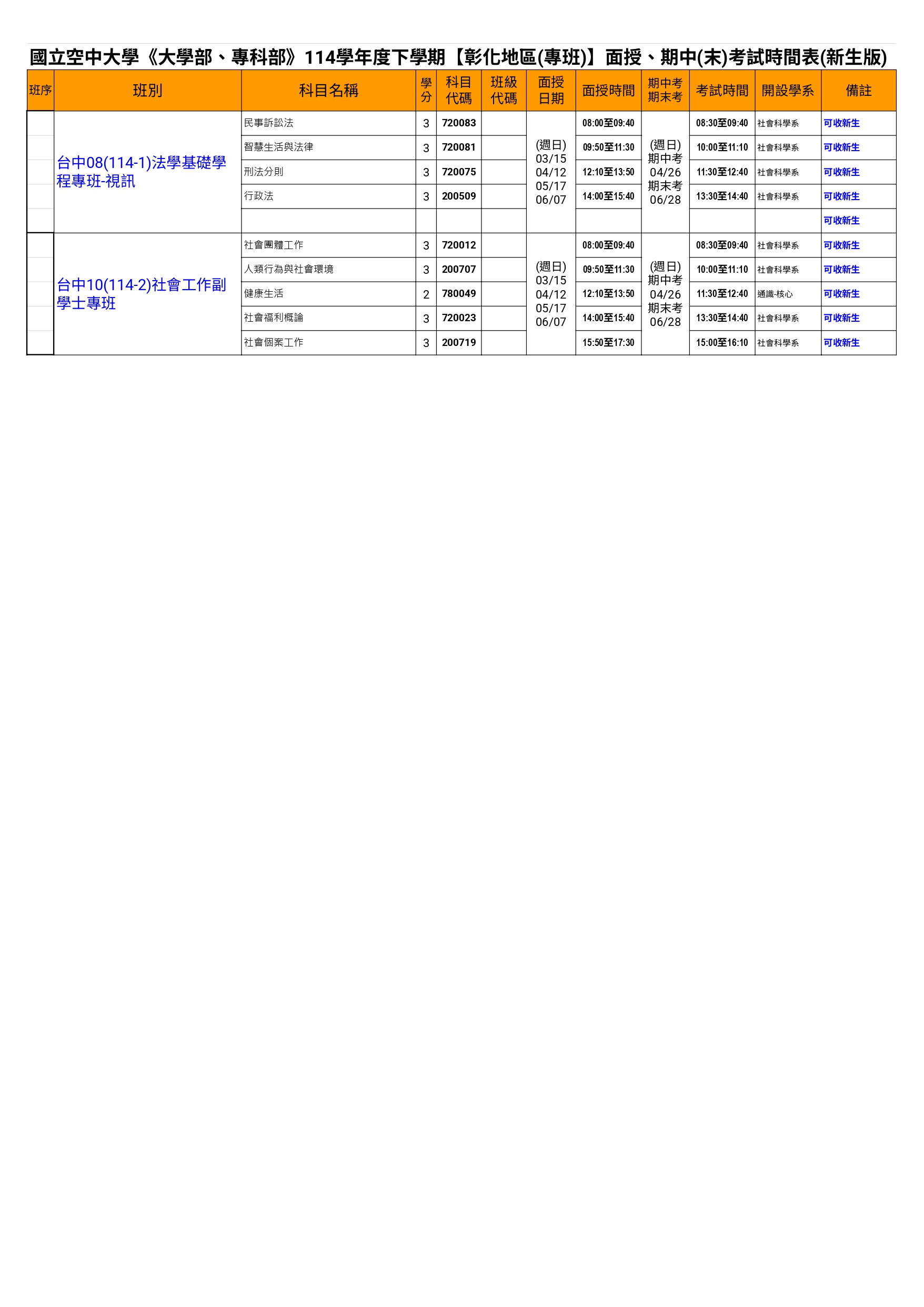 114(下)彰化【地區(專班)】面授、考試一覽表-新生版