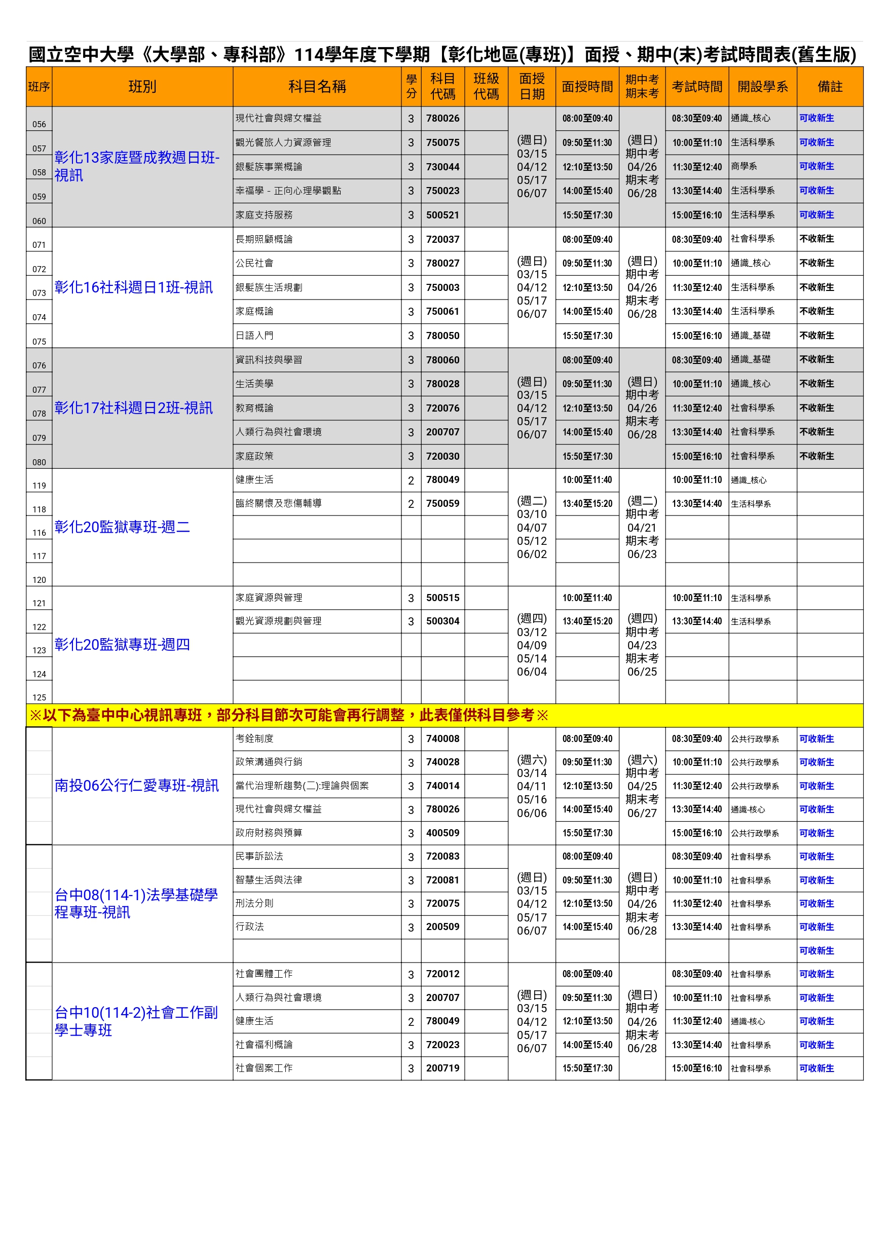 114(下)彰化【地區(專班)】面授、考試一覽表-舊生版
