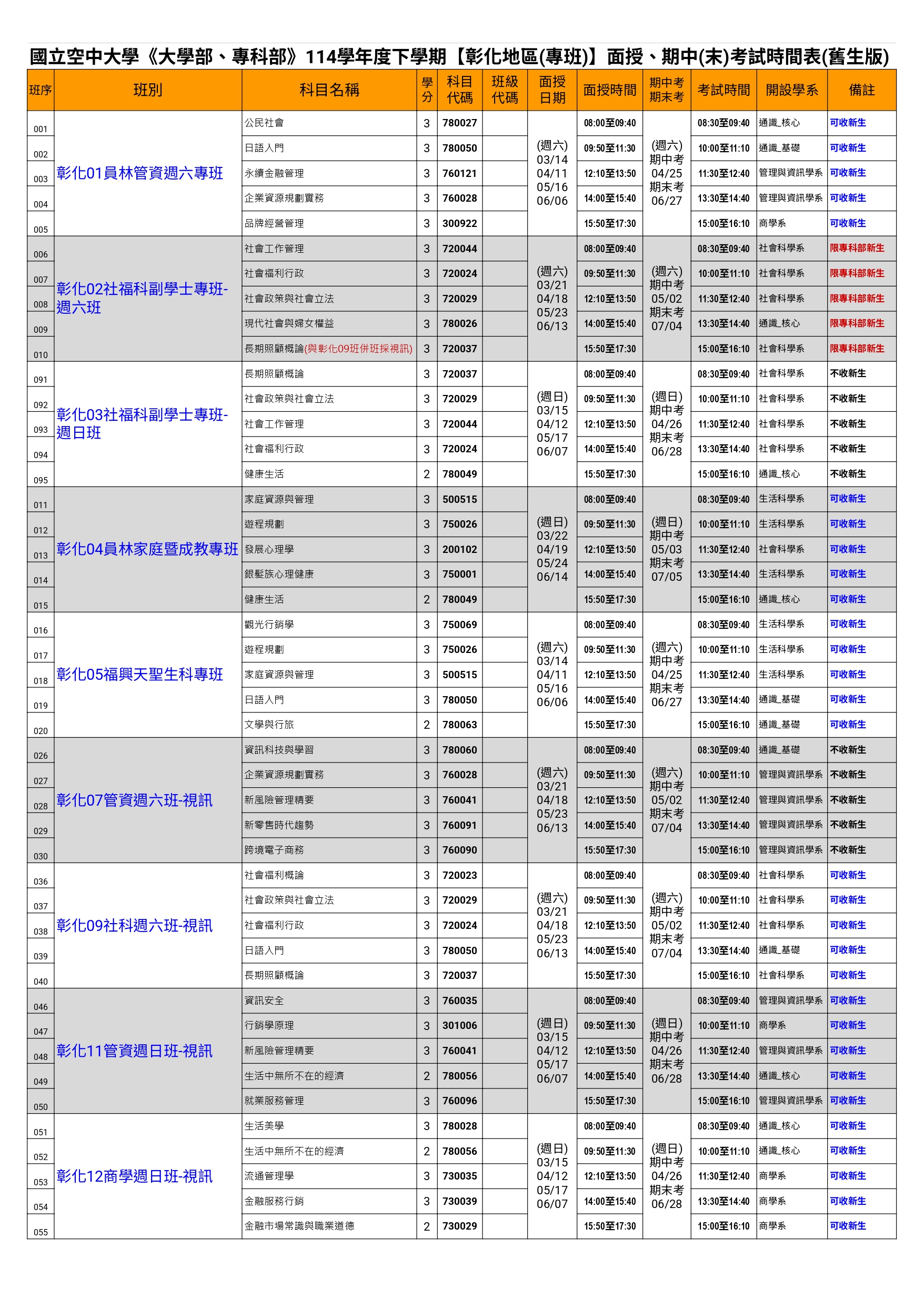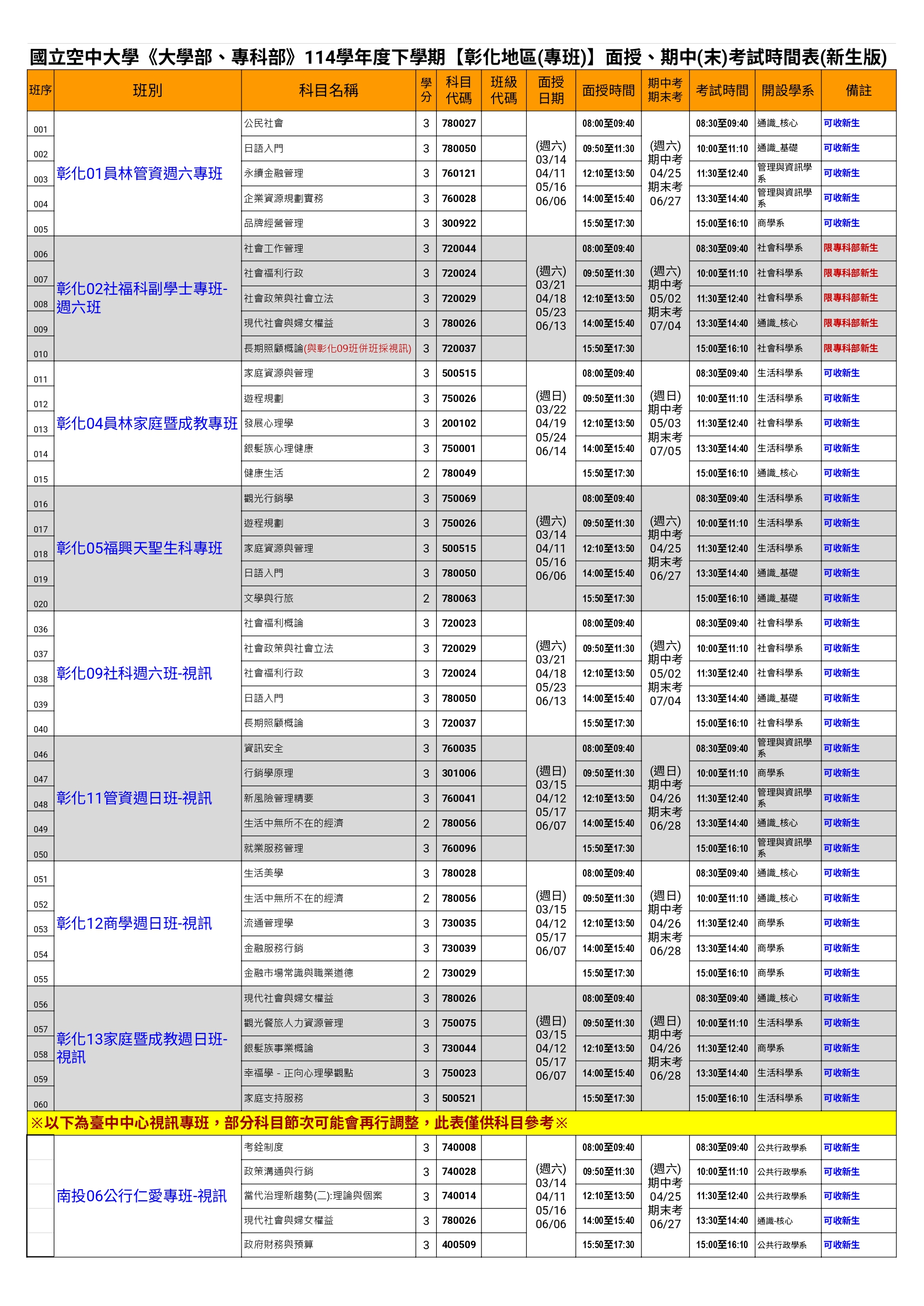114(上)彰化地區專班生課程表-新生版