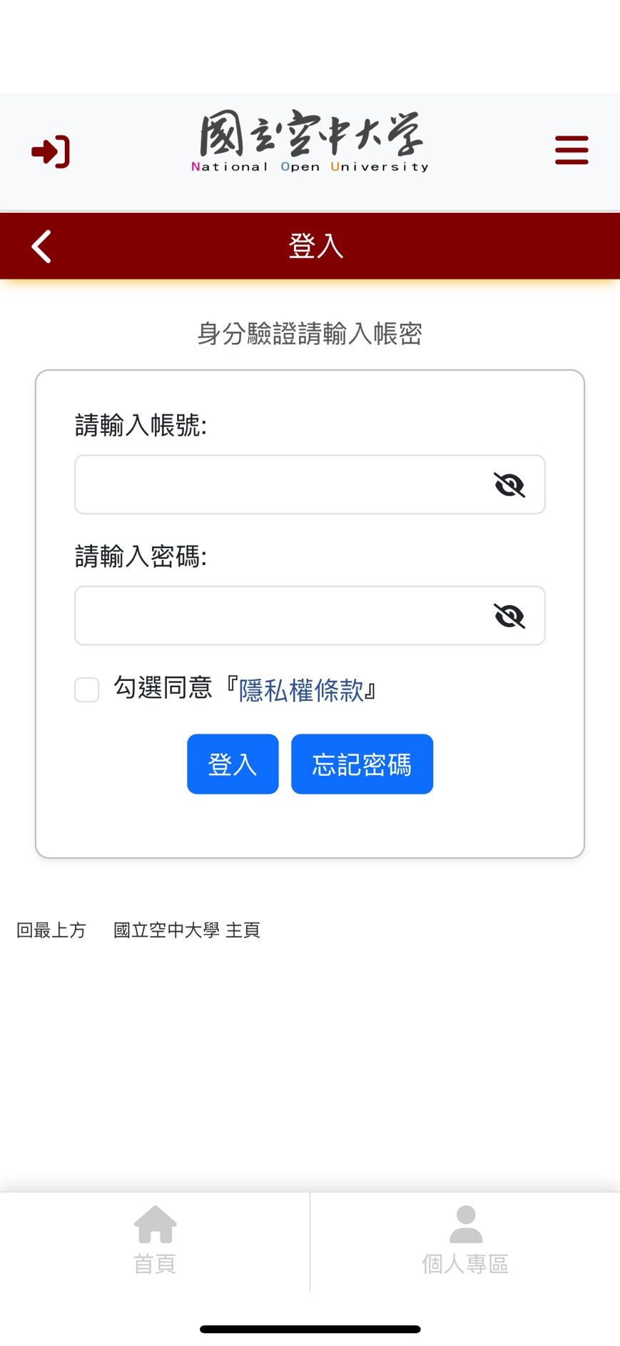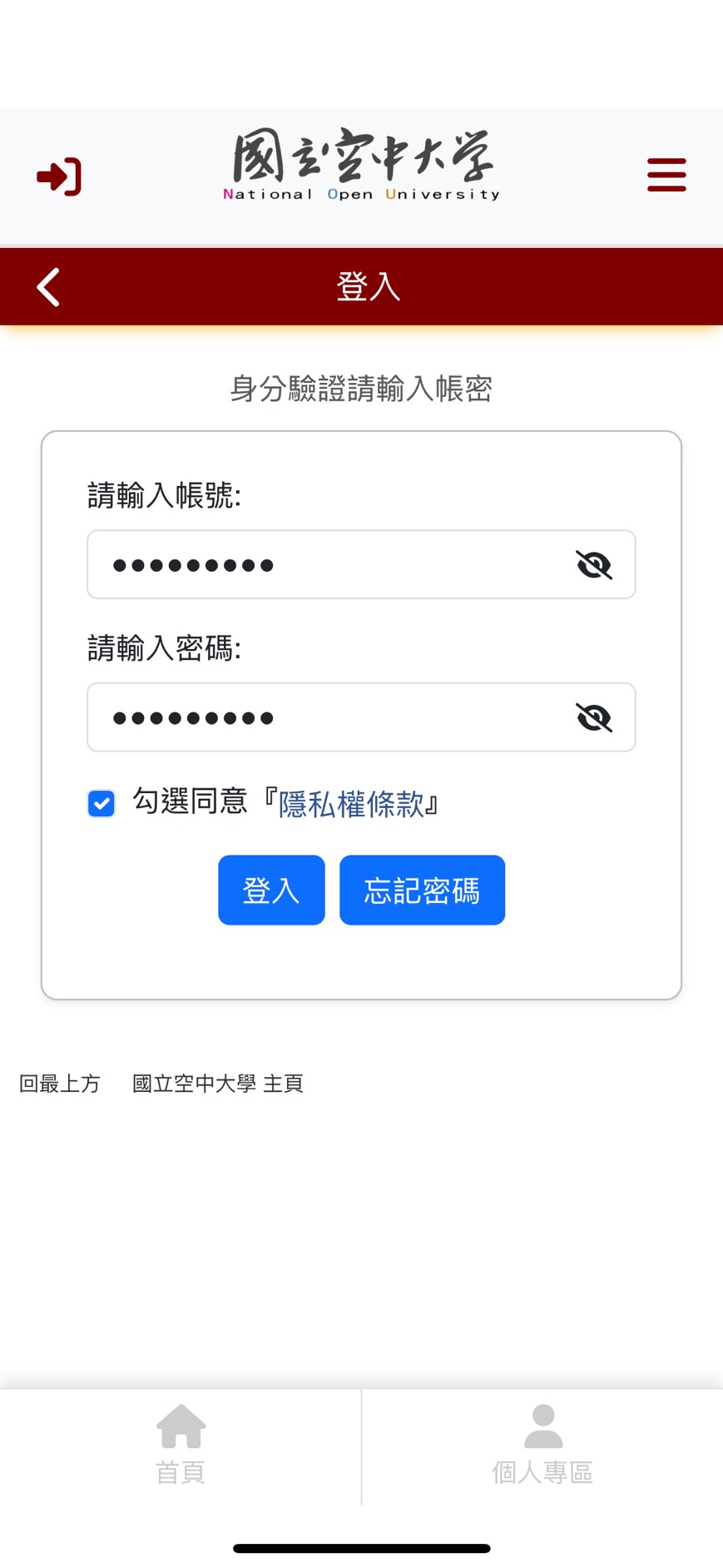 - 點選【個人專區】登入→帳號為學號,密碼為身分證(如修改過則以修改後之新密碼為主)
