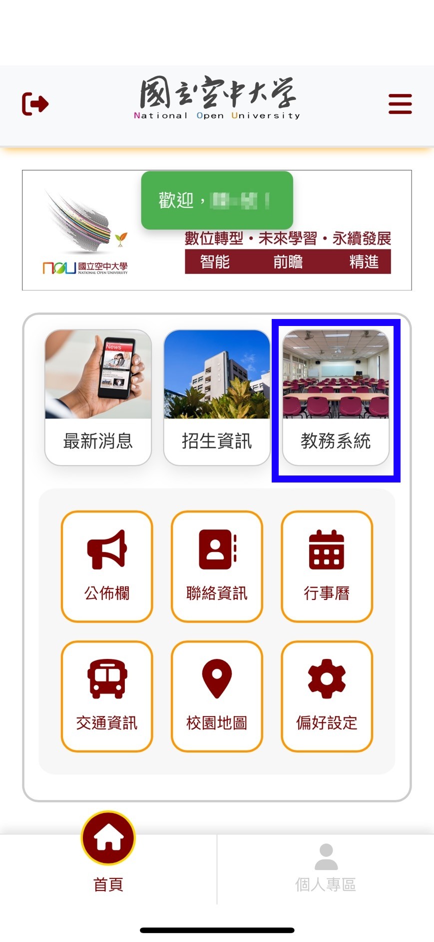 - 登入後回首頁點選【教務系統】→等系統跑一下