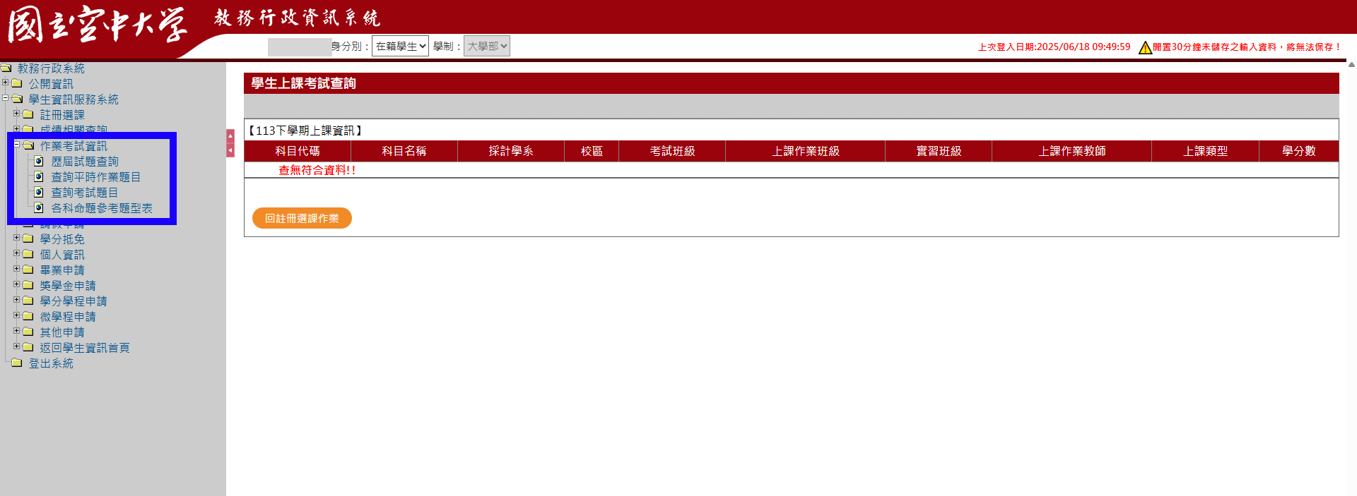 - 左方「學生資訊服務系統」→點選「作業資訊」→查詢「平時作業題目」