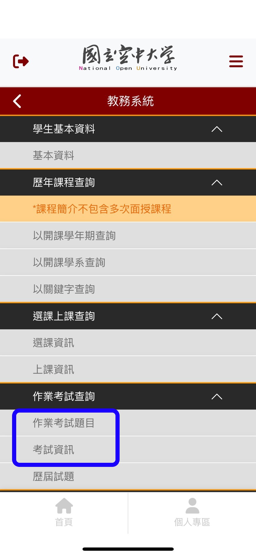 登入→點選首頁左側功能欄位【作業考試資訊】→即可查看當學期作業考試資訊(若當學期無註冊則無資料)