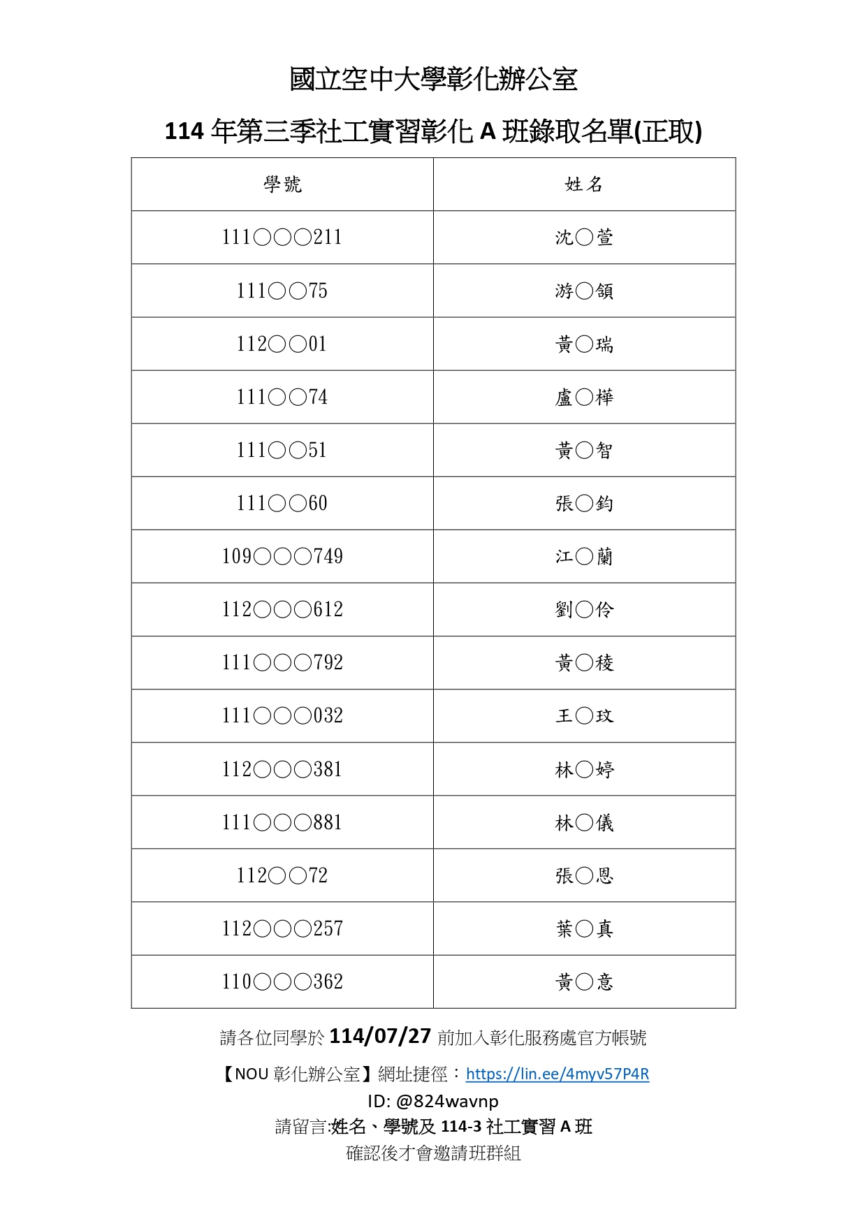 請各位同學於114/07/27 16:00前加入彰化服務處官方帳號【NOU彰化辦公室...