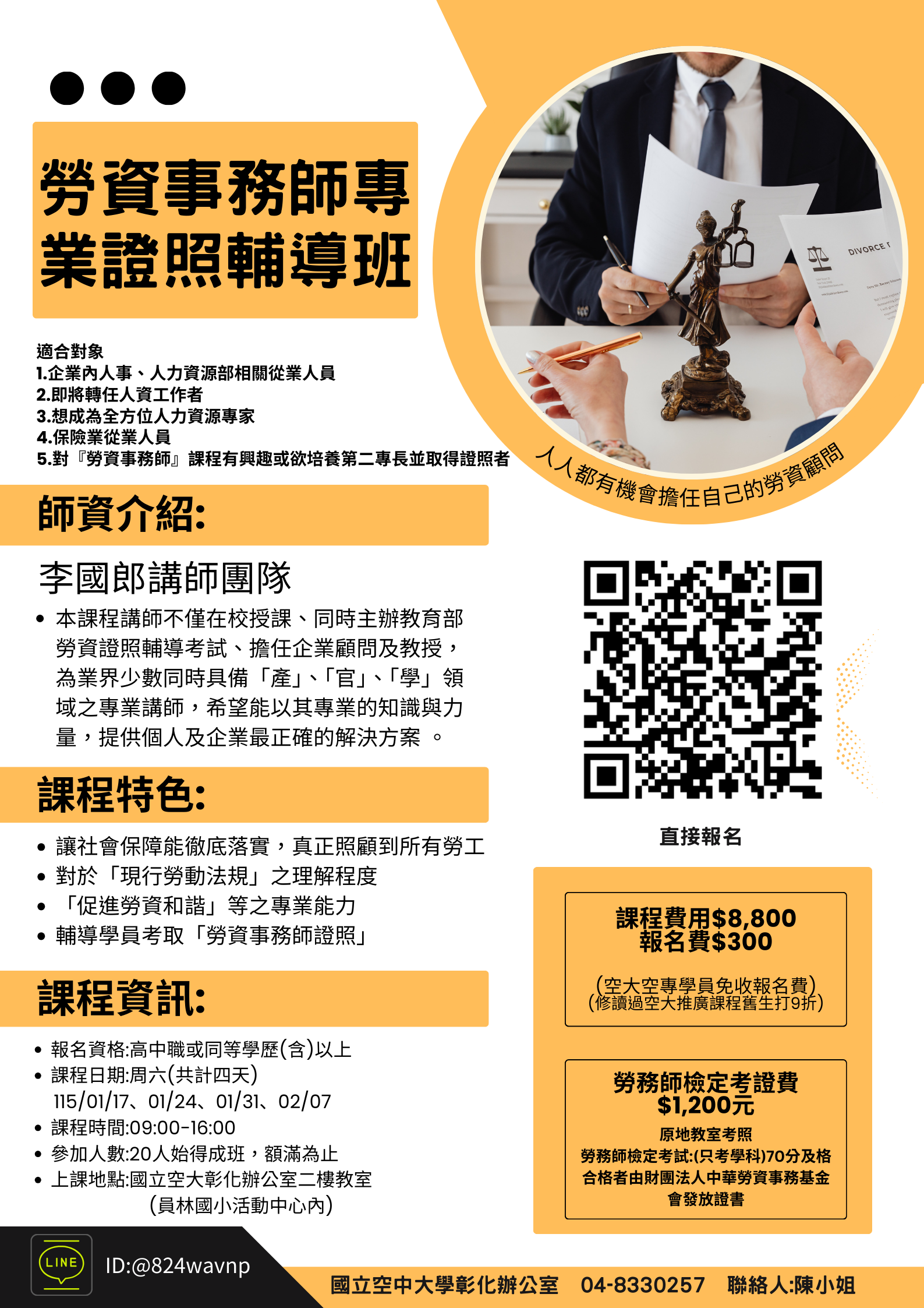 勞資事務師專業證照輔導班招生中(推廣非學分班)報名截止課程目標:1.培養當下最熱門之...