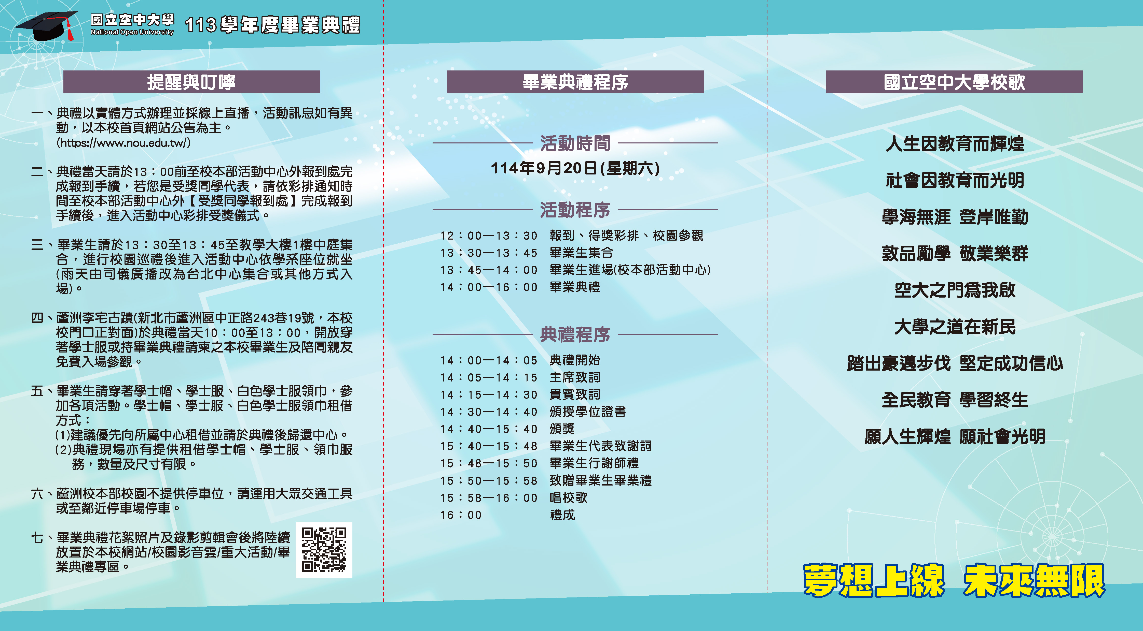 (上方程序表及邀請卡內容如下方文字說明)【夢想上線 未來無限】 國立空中大學113學...