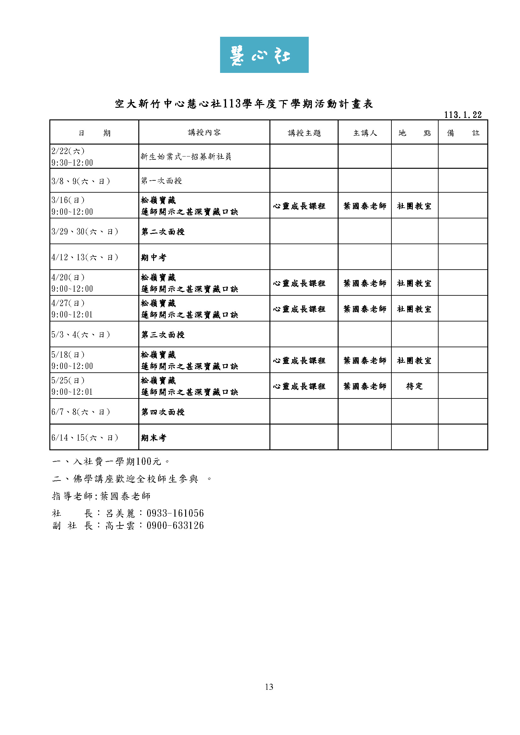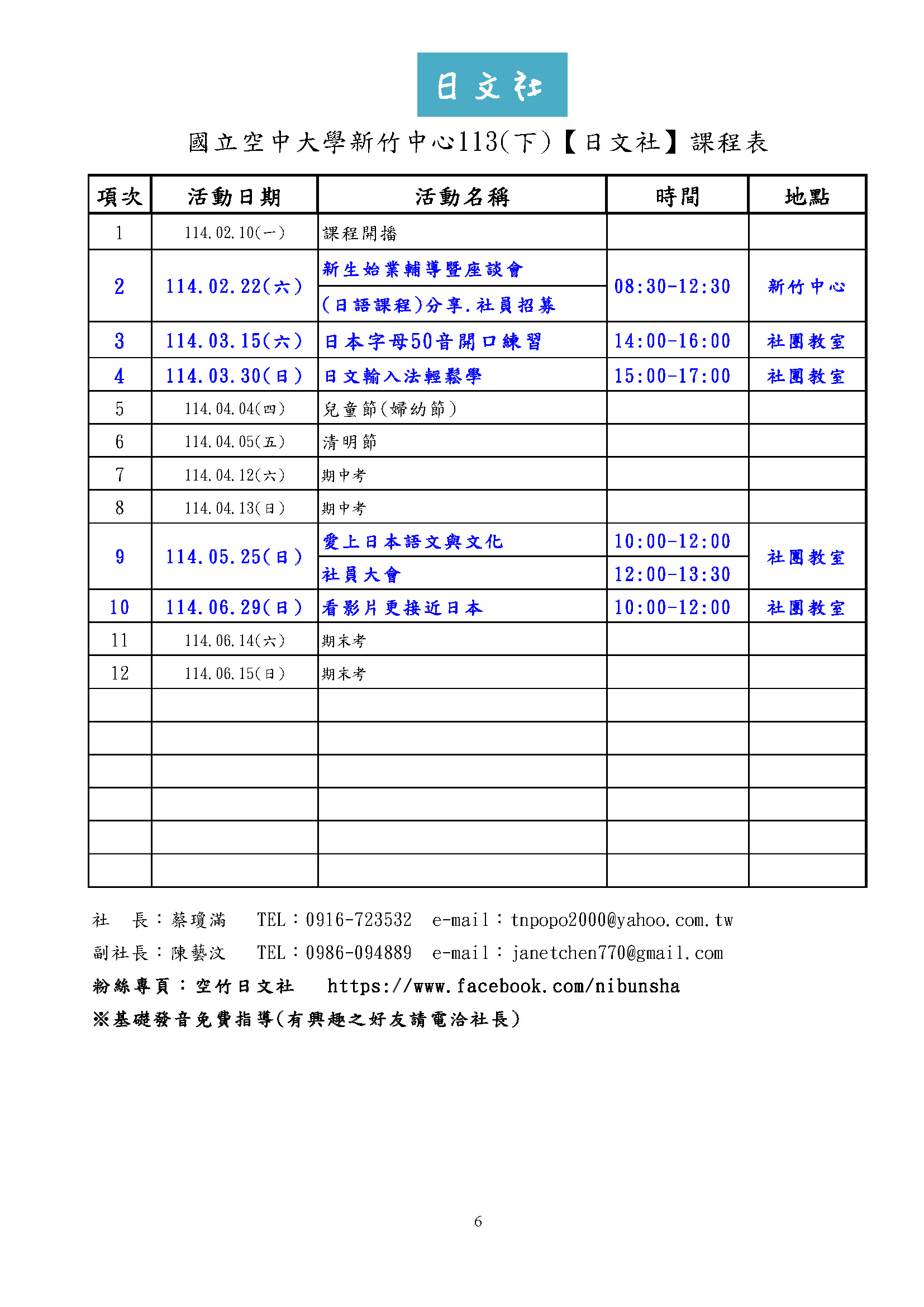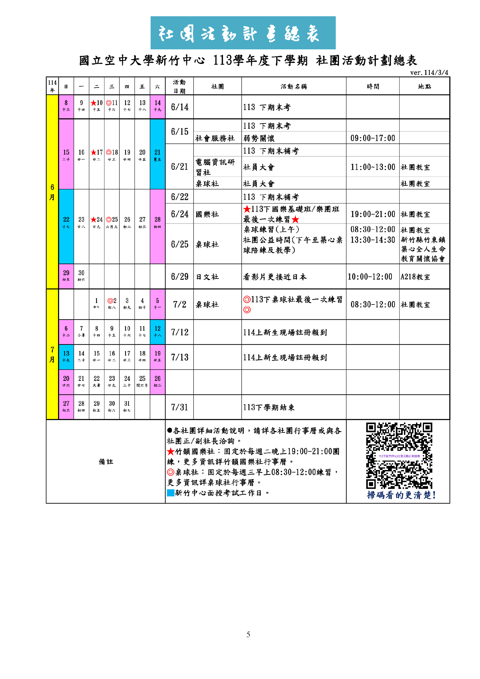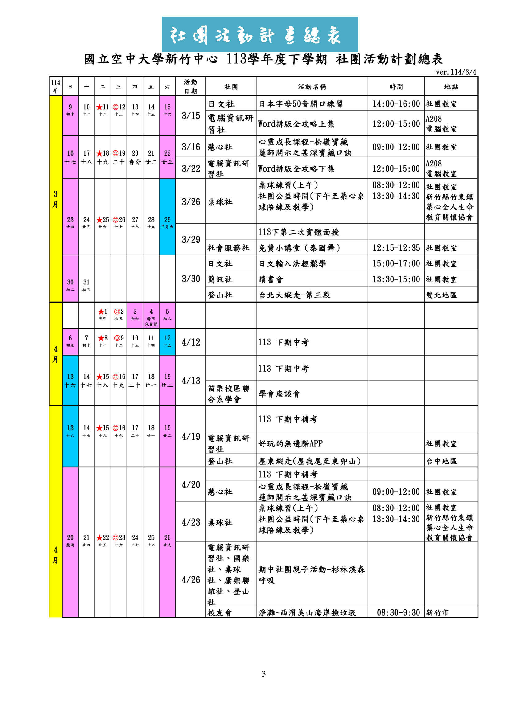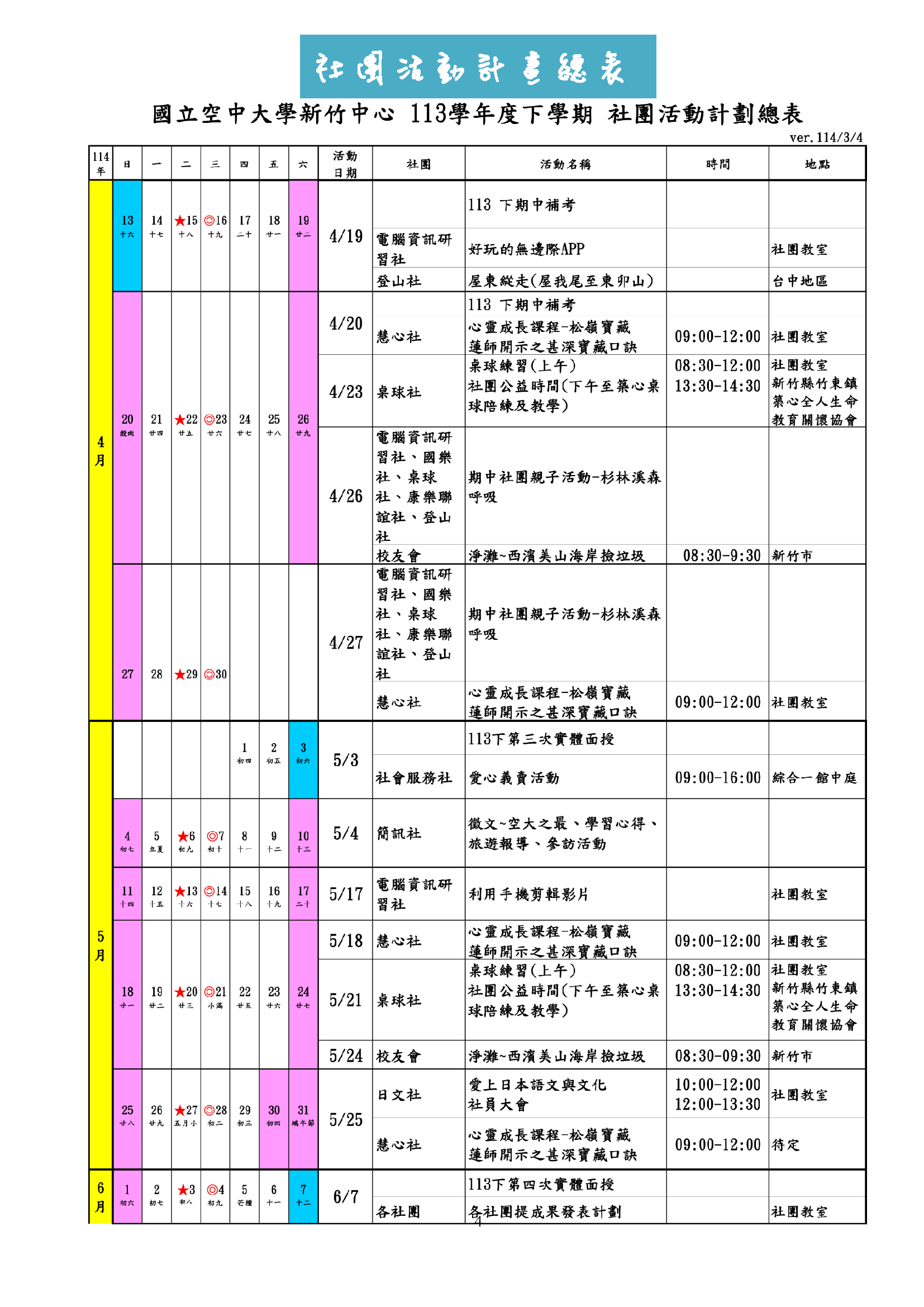 新竹中心 113學年度下學期 各社團活動行事曆