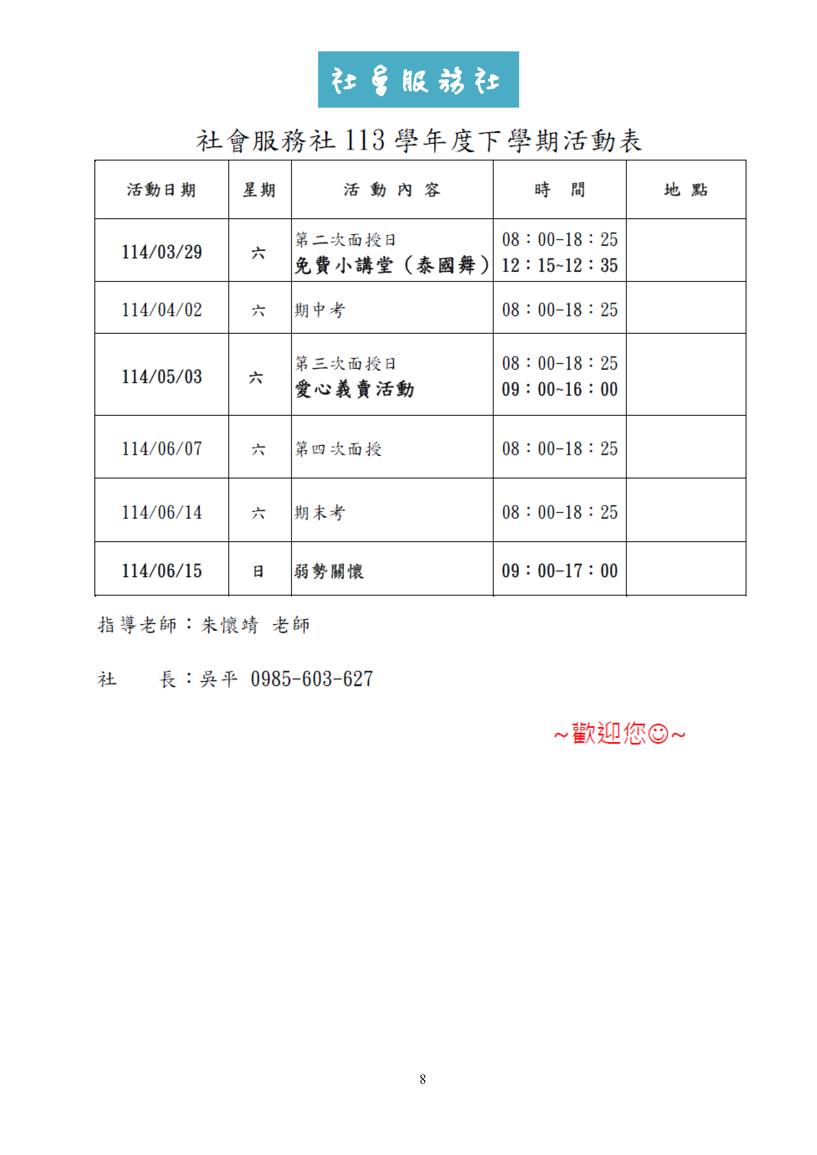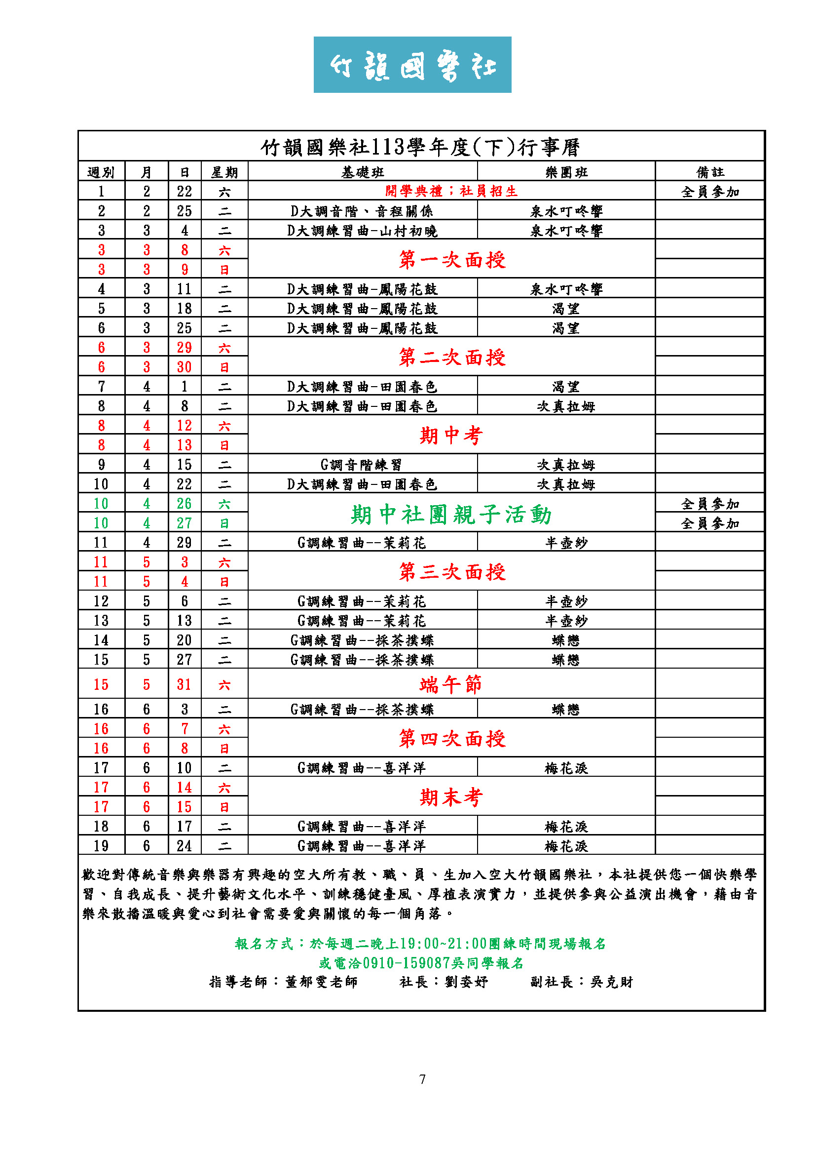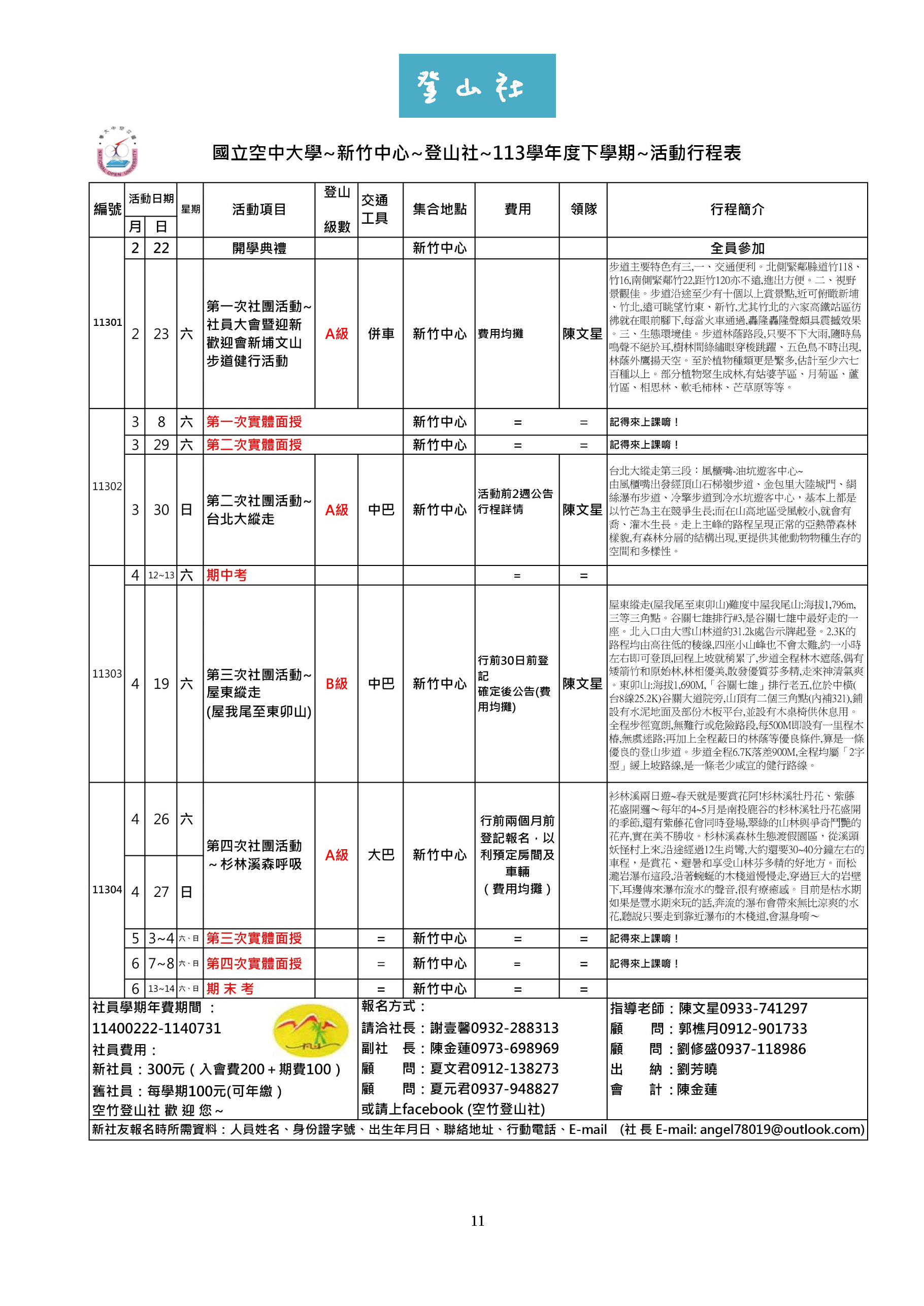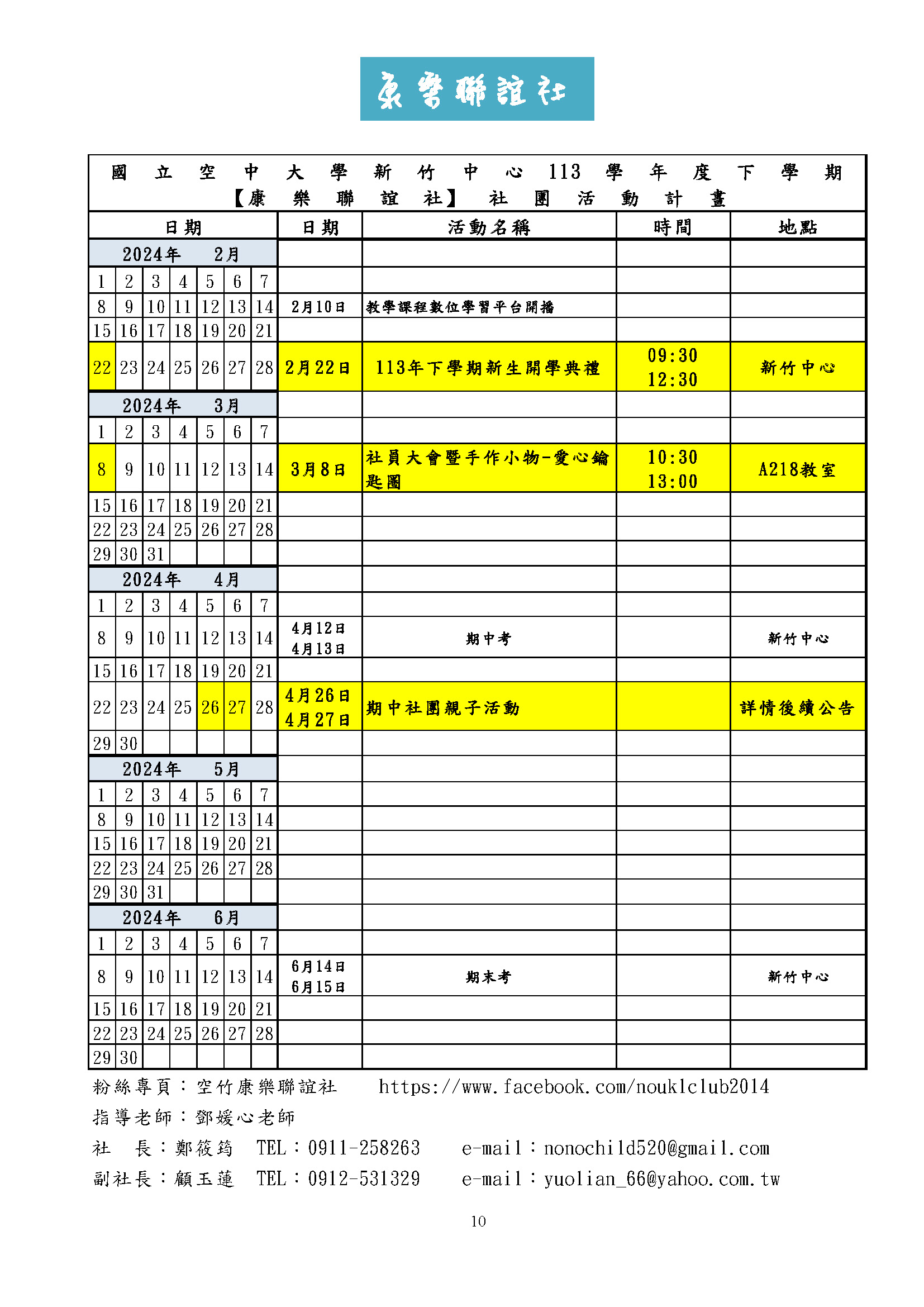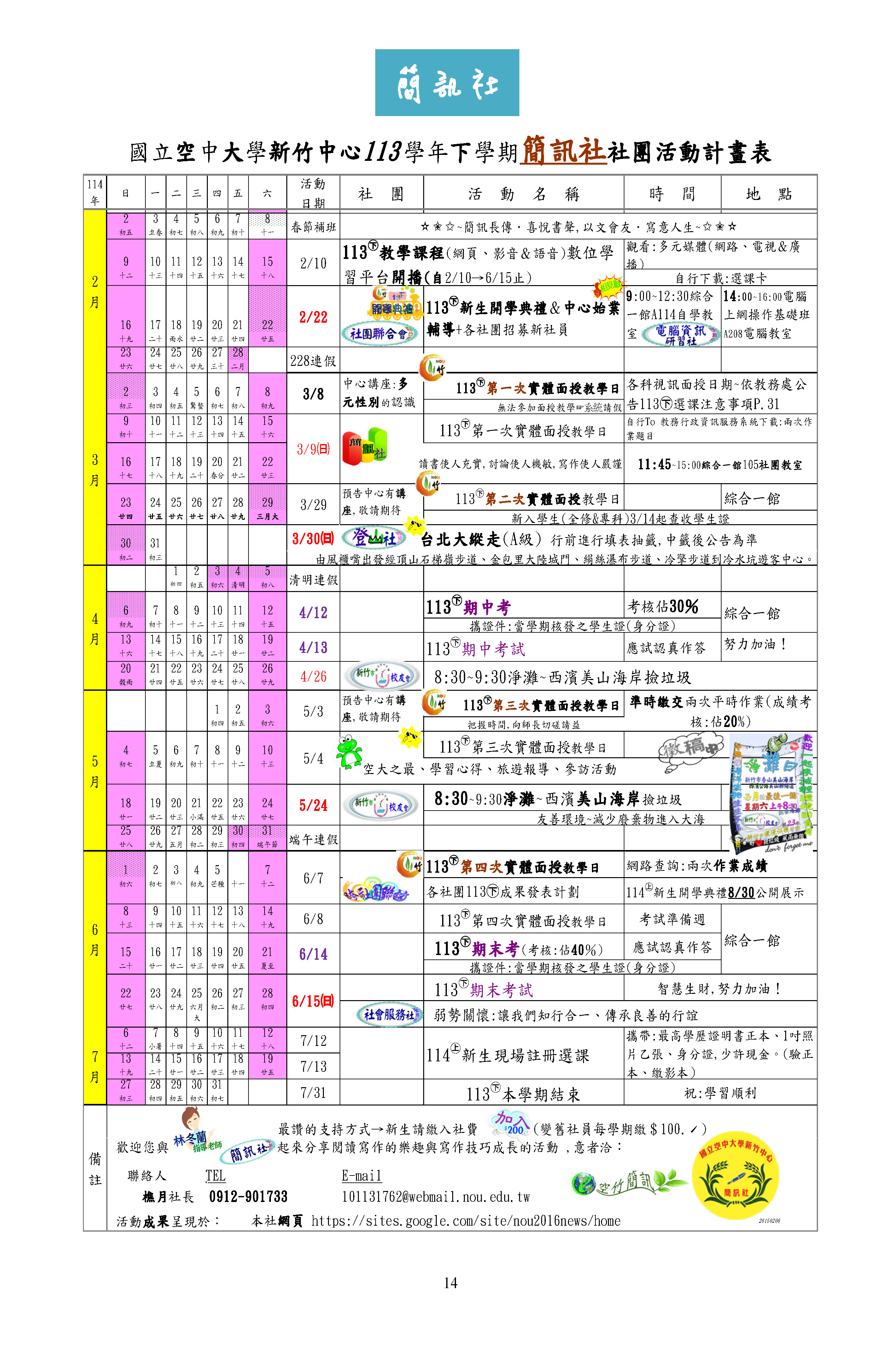 新竹中心 113學年度下學期 各社團活動行事曆