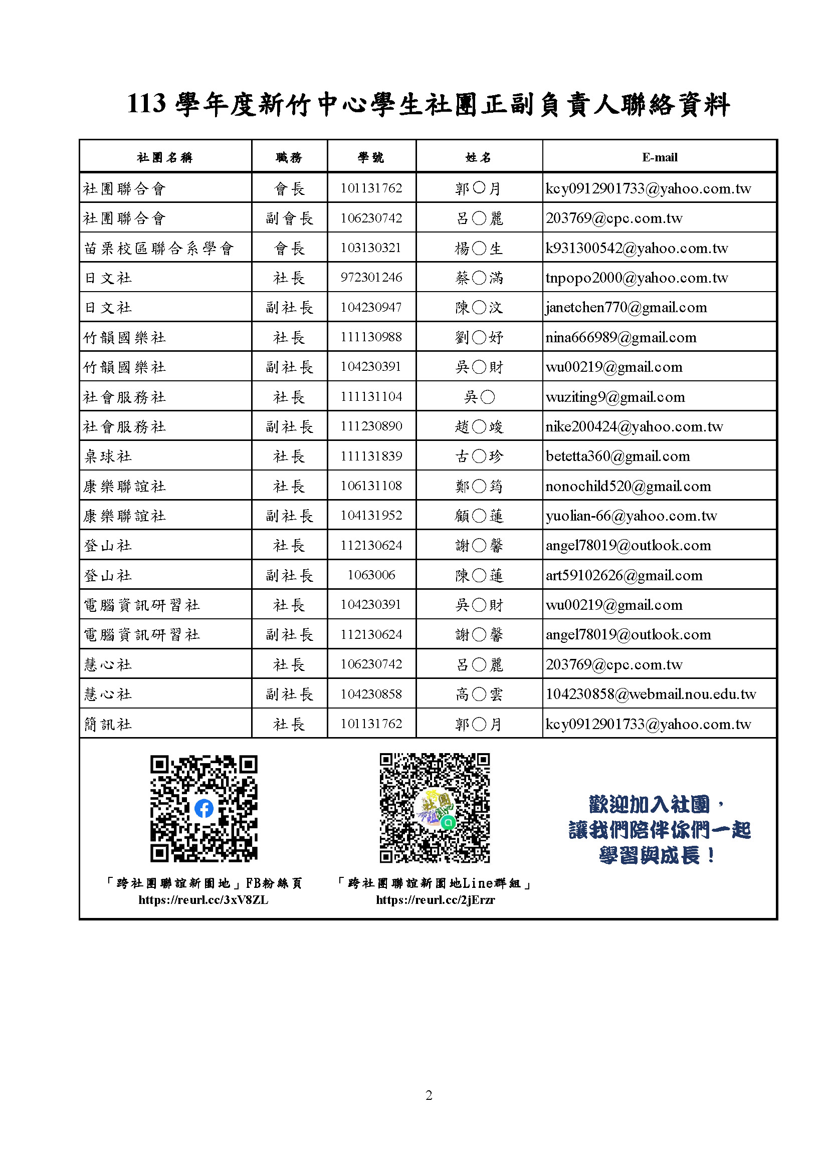 113學年度新竹中心學生社團正副負責人聯絡資料