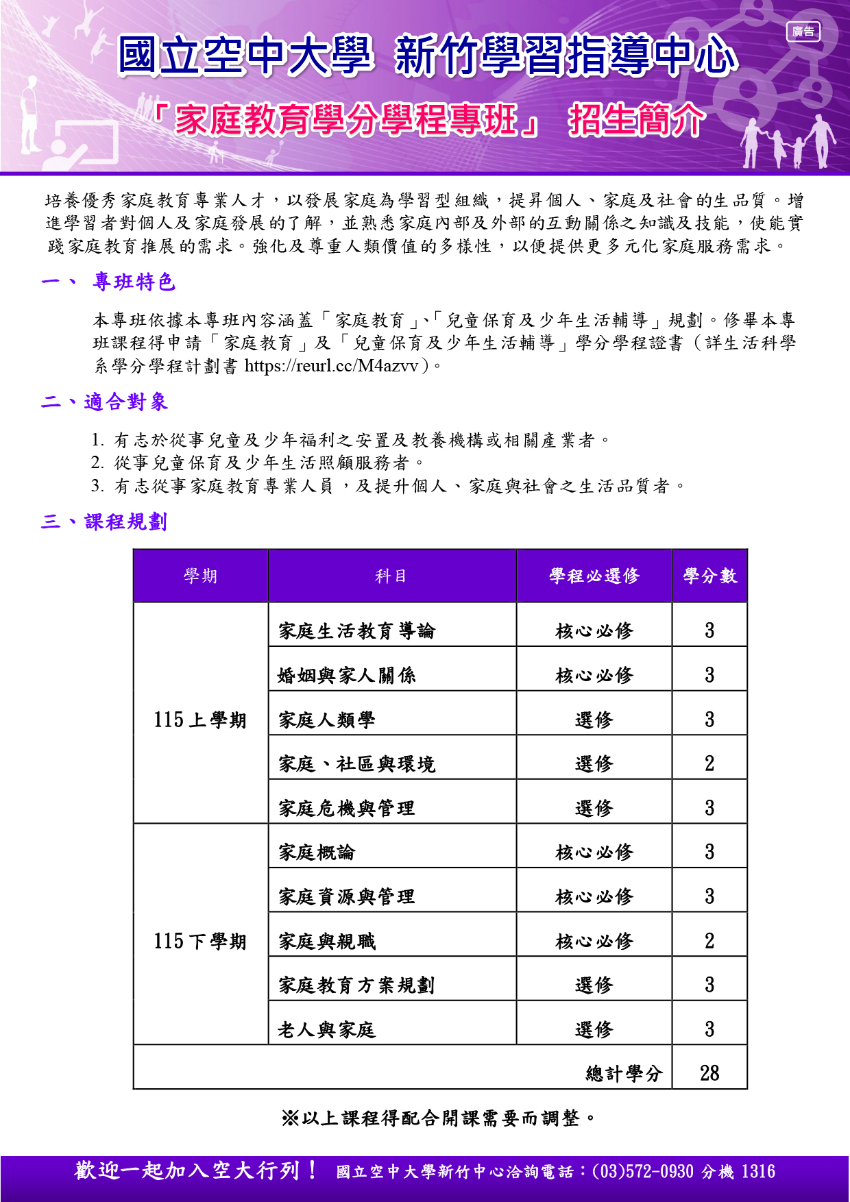 * 家庭教育專班之學分可向教育部家庭教育資源網申請家庭教育專業人員認證,認證相關資訊說明詳:https://reurl.cc/rEkgYO
