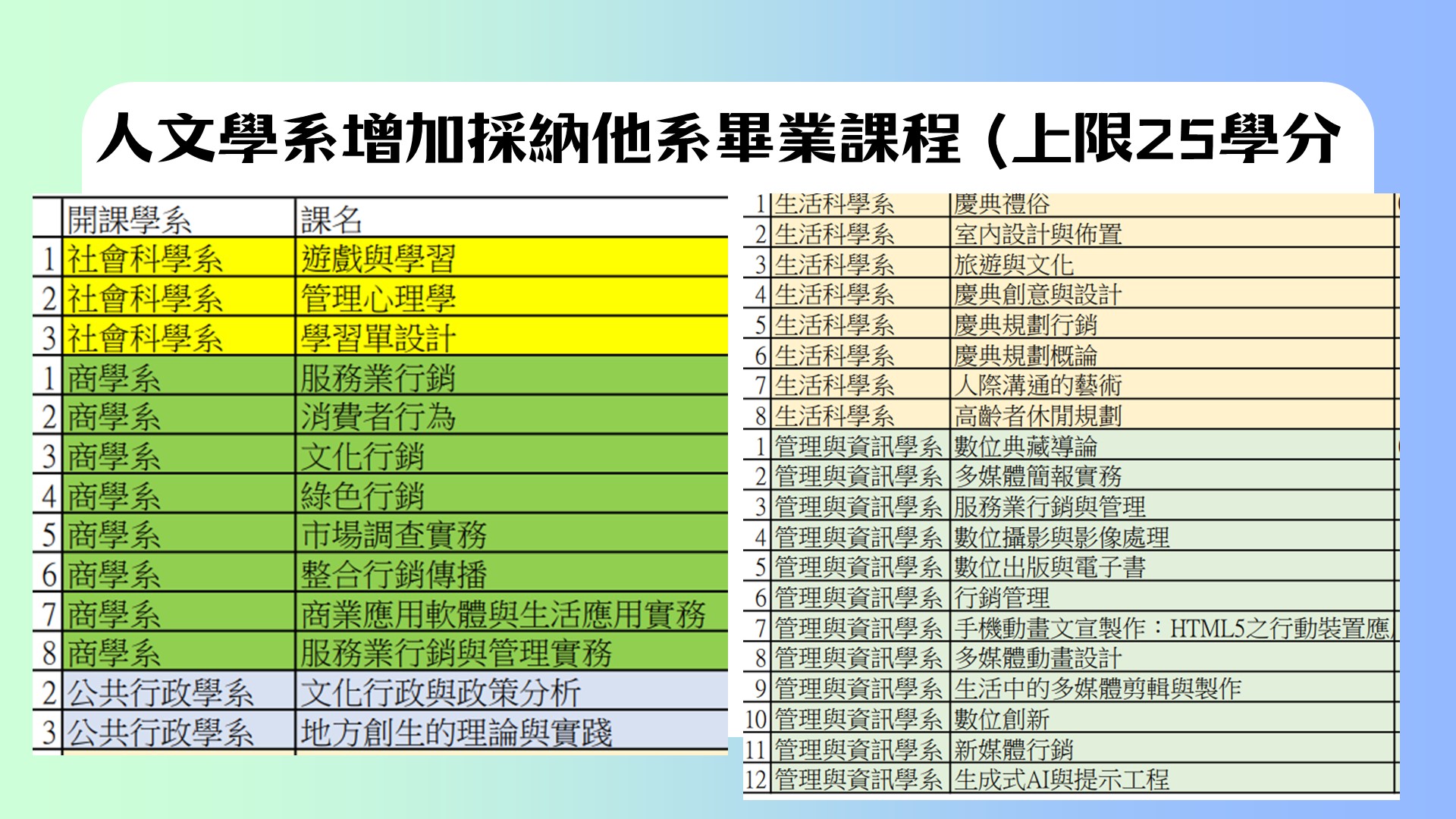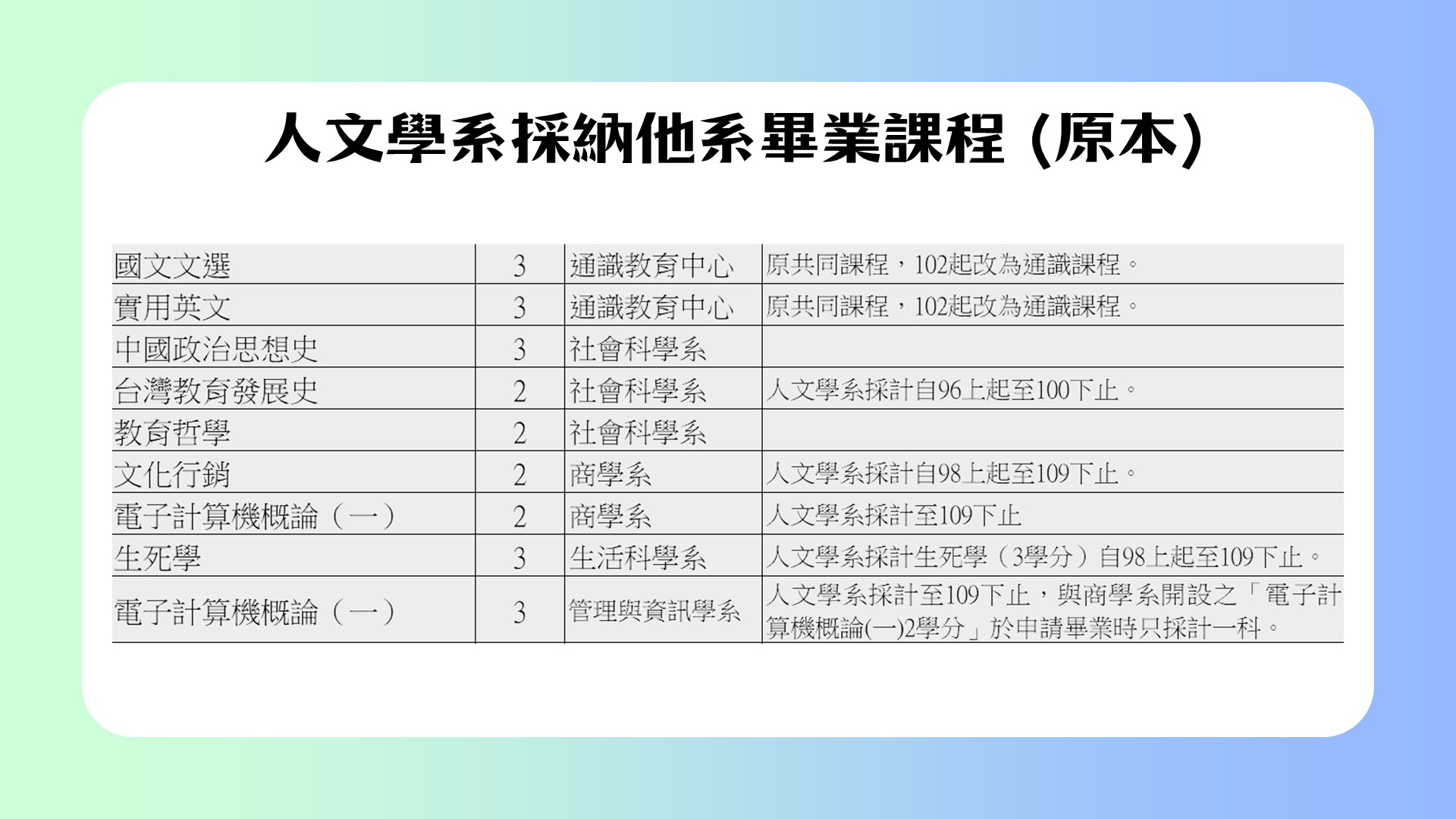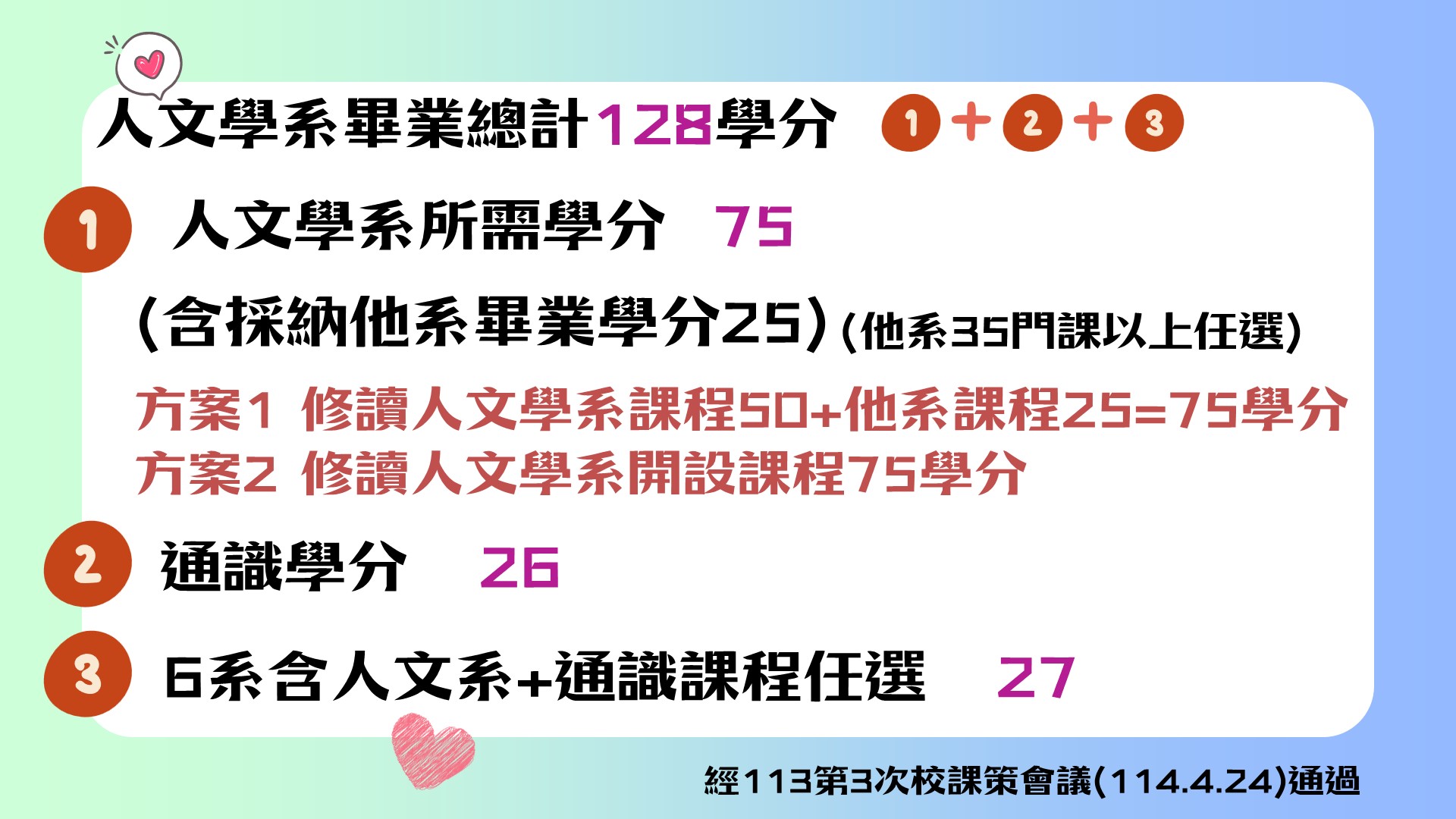 自114上起,人文學系畢業採計他系學分1.從20改為25學分2.新增採計33門無論10或20年前入學者一律適用。