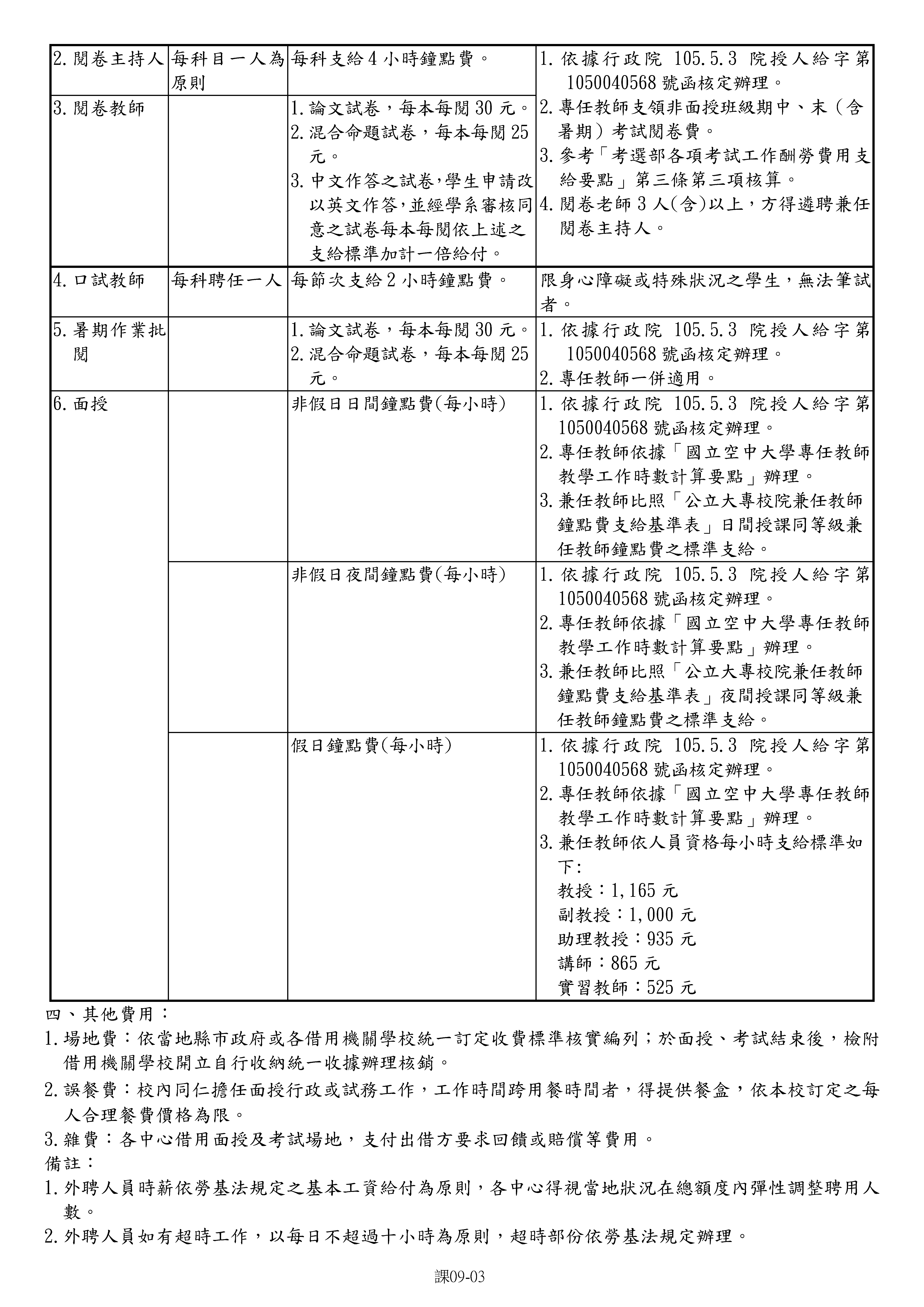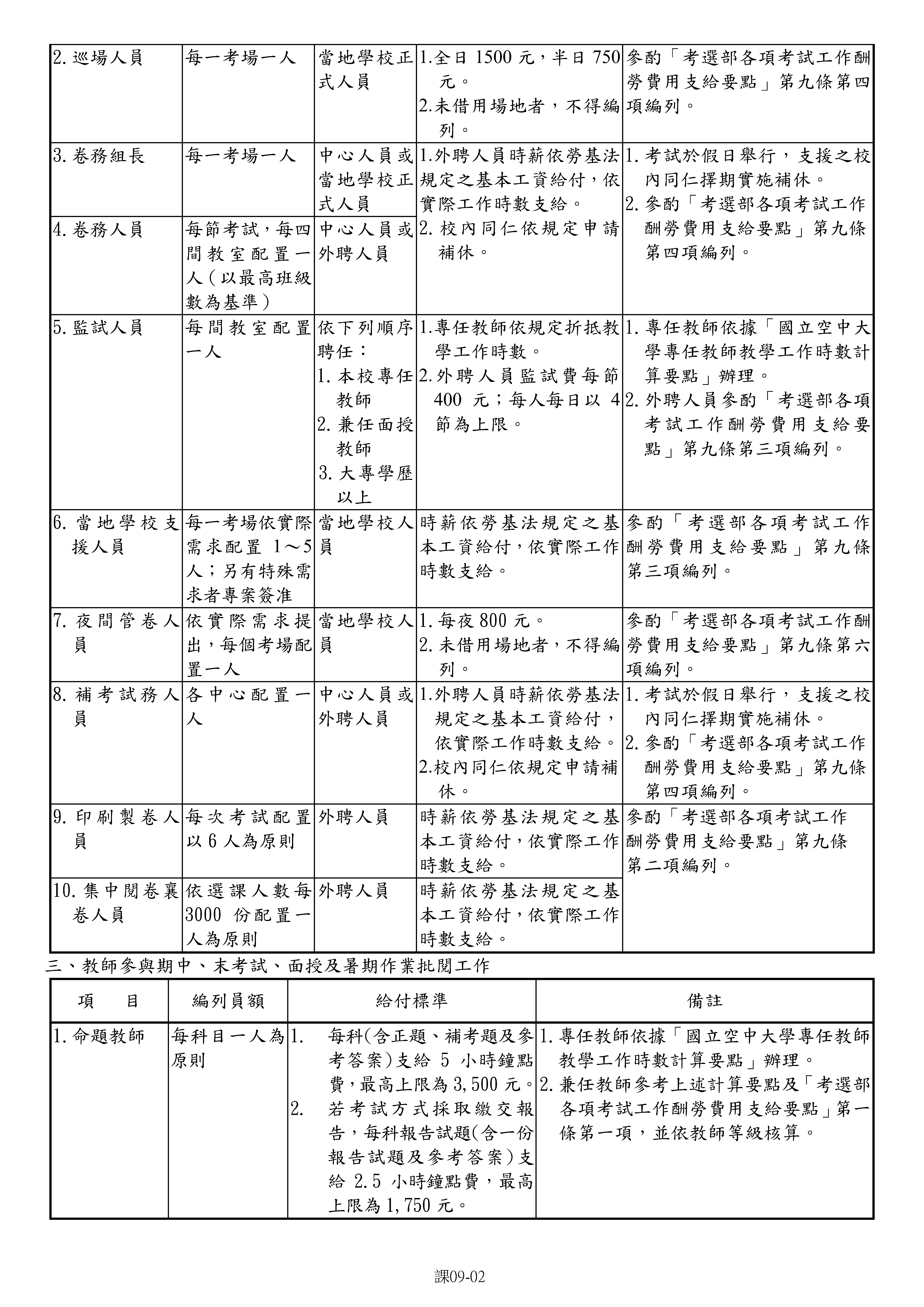 【兼任教師】空中大學面授、考試工作人員配置及支給標準