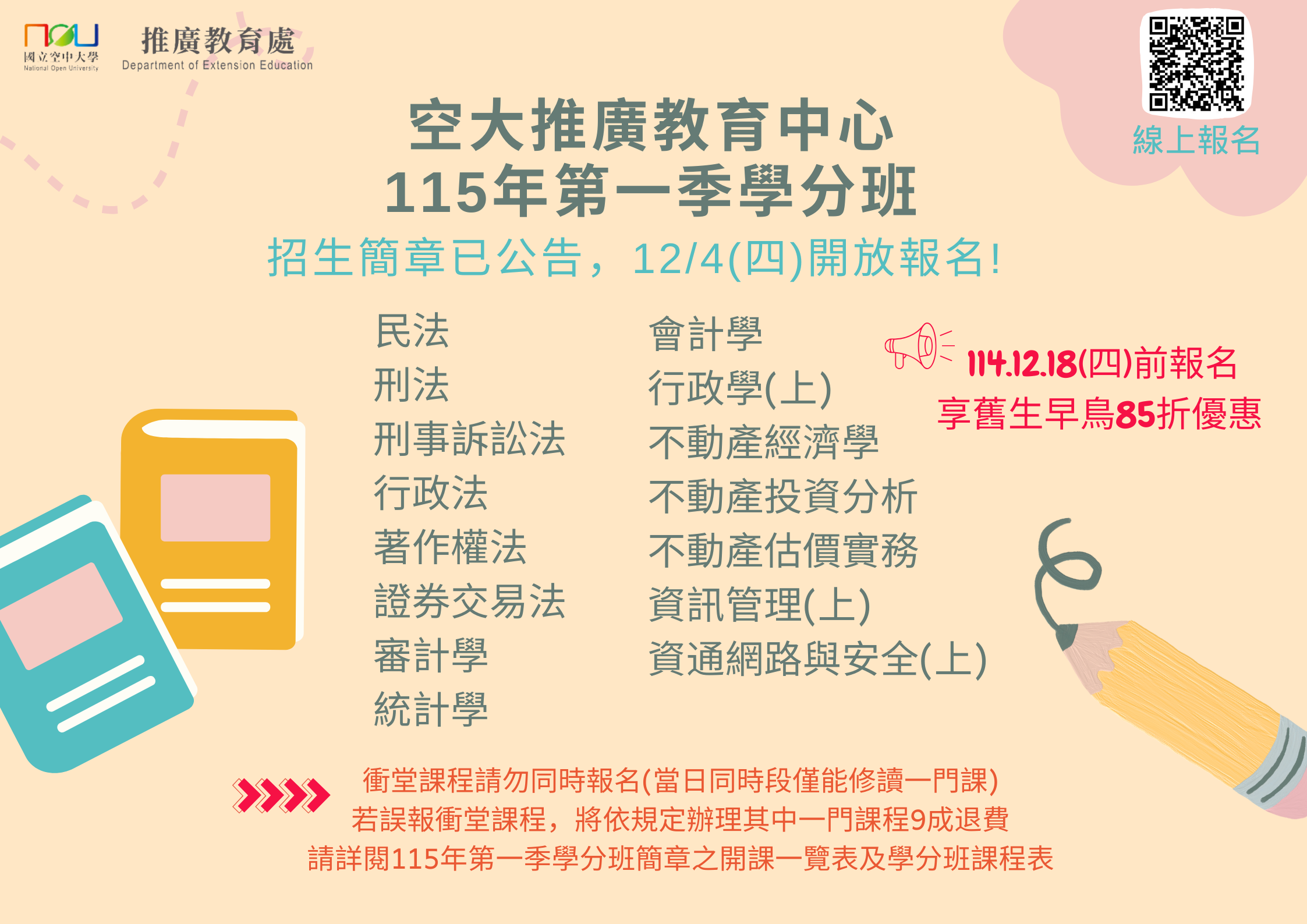 114年12月4日(星期四) 早上10:00 開放網路報名 ►https://eec.nou.edu.tw/pop/signup/PopMainAction.do?method=index
