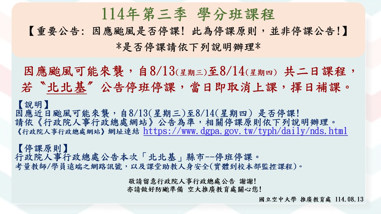 【重要公告 : 因應颱風是否8/13(星期三)-8/14(星期四)課程停課! 】 ...