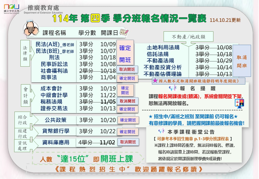 【課程報名情況一覽表 ( 10/21修正公告 )】 114年第四季學分班課程114年...
