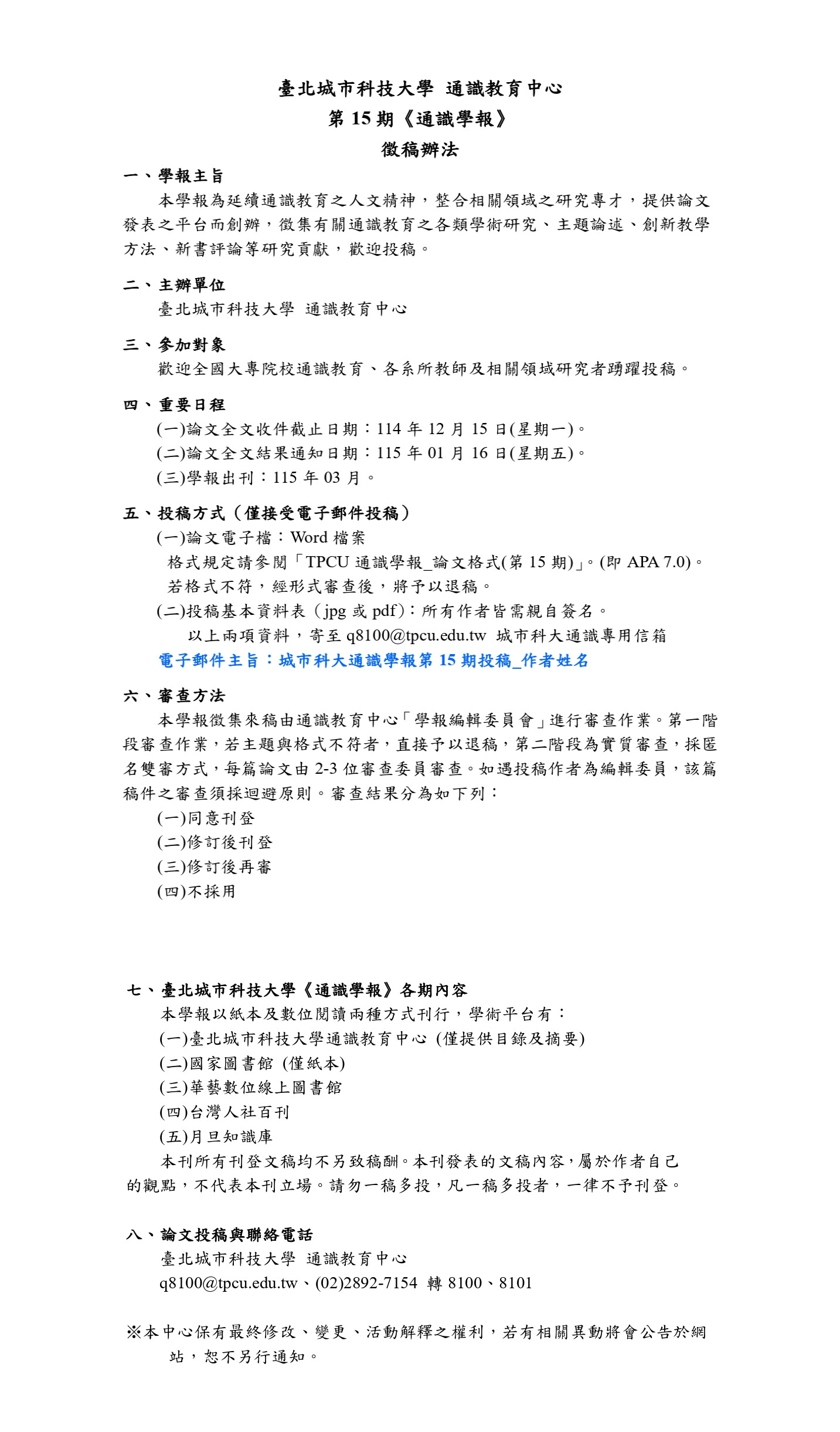 城市學校財團法人臺北城市科技大學辦理第15期《通識學報》徵稿,敬請踴躍賜稿