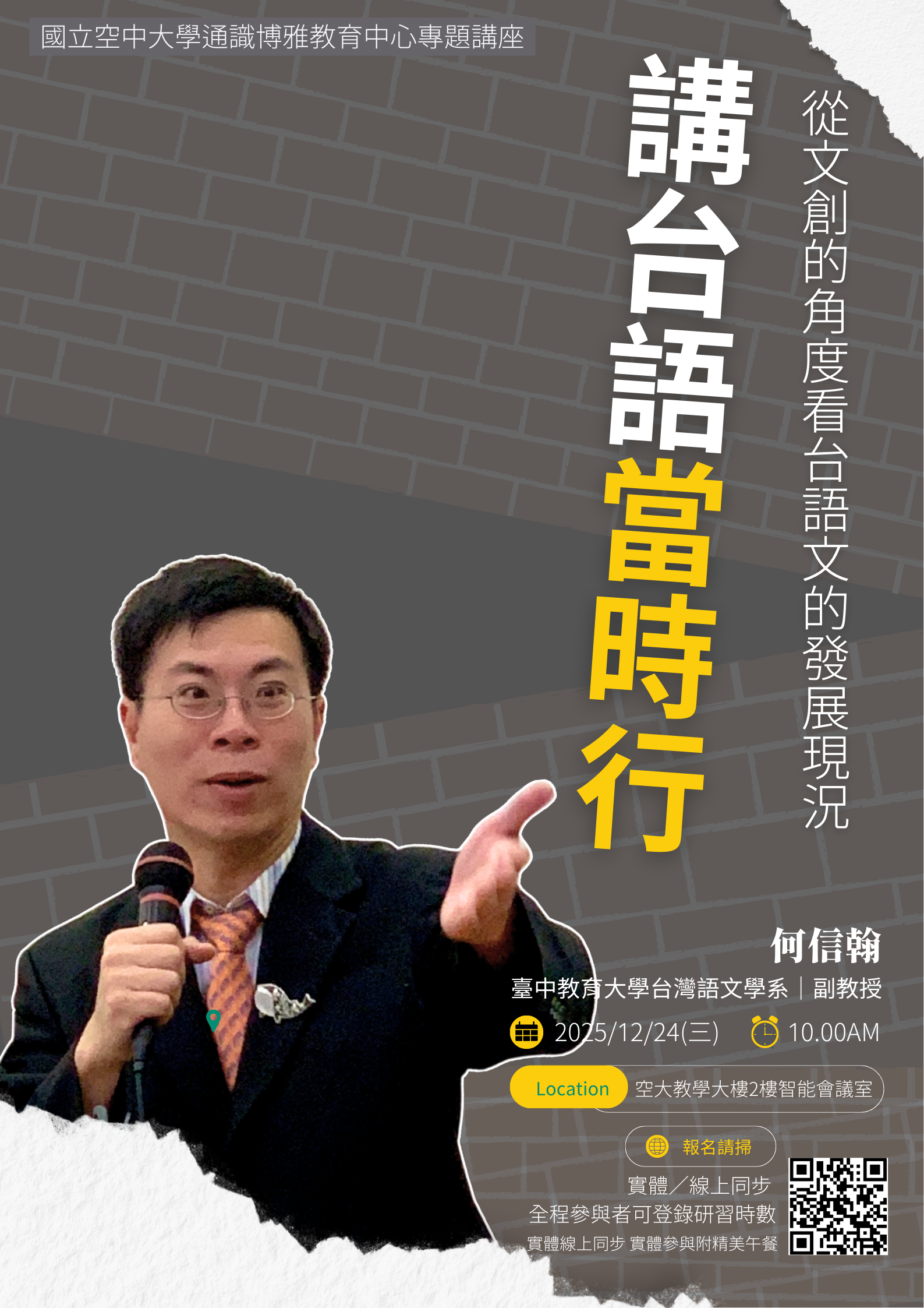 【講台語, 當時行——從文創的角度看台語文的發展現況】講座邀請到台中教育大學台灣語文學系、同時亦為台語文運動者的何信翰副教授擔任講者。何副教授參與多項國家語言推展工作,近年常任各類節目的台語顧問;其與鏡電視合作的「台語聽有無」深受觀眾喜愛,並曾獲教育部「推展本土語言傑出貢獻獎」。