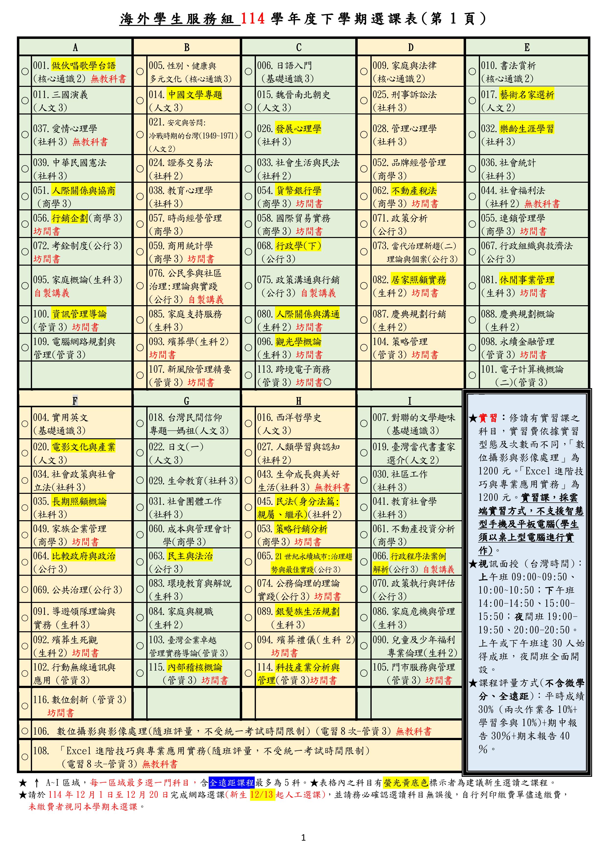 114下舊生選課注意事項,PDF檔案,另開視窗網路選課(含學分學雜費減免)操作指引...