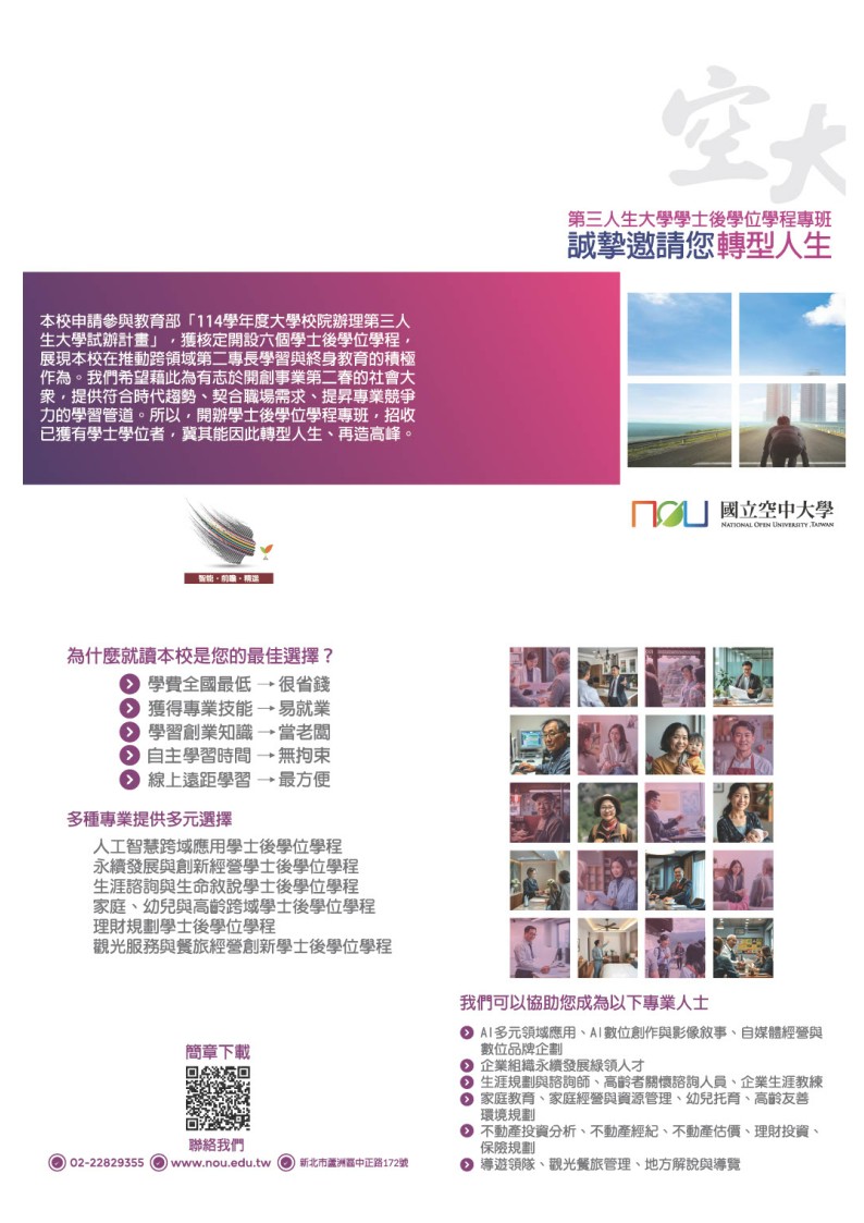 【國立空中大學第三人生大學學士後學位學程專班招生中!】招生資訊https://www...