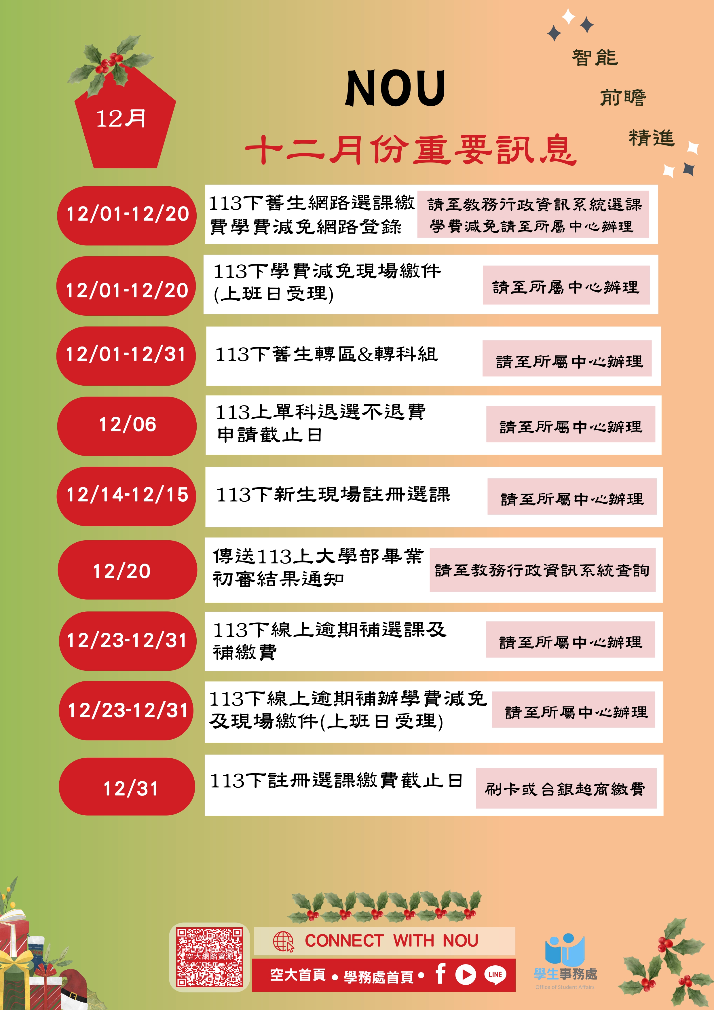 12/01-12/20 113下舊生網路選課繳費學費減免網路登錄