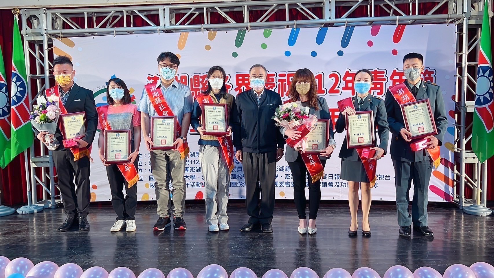 徐啟文(右1)及葉佳容(右2)同學,當選「澎湖縣112年社會優秀青年」大合影