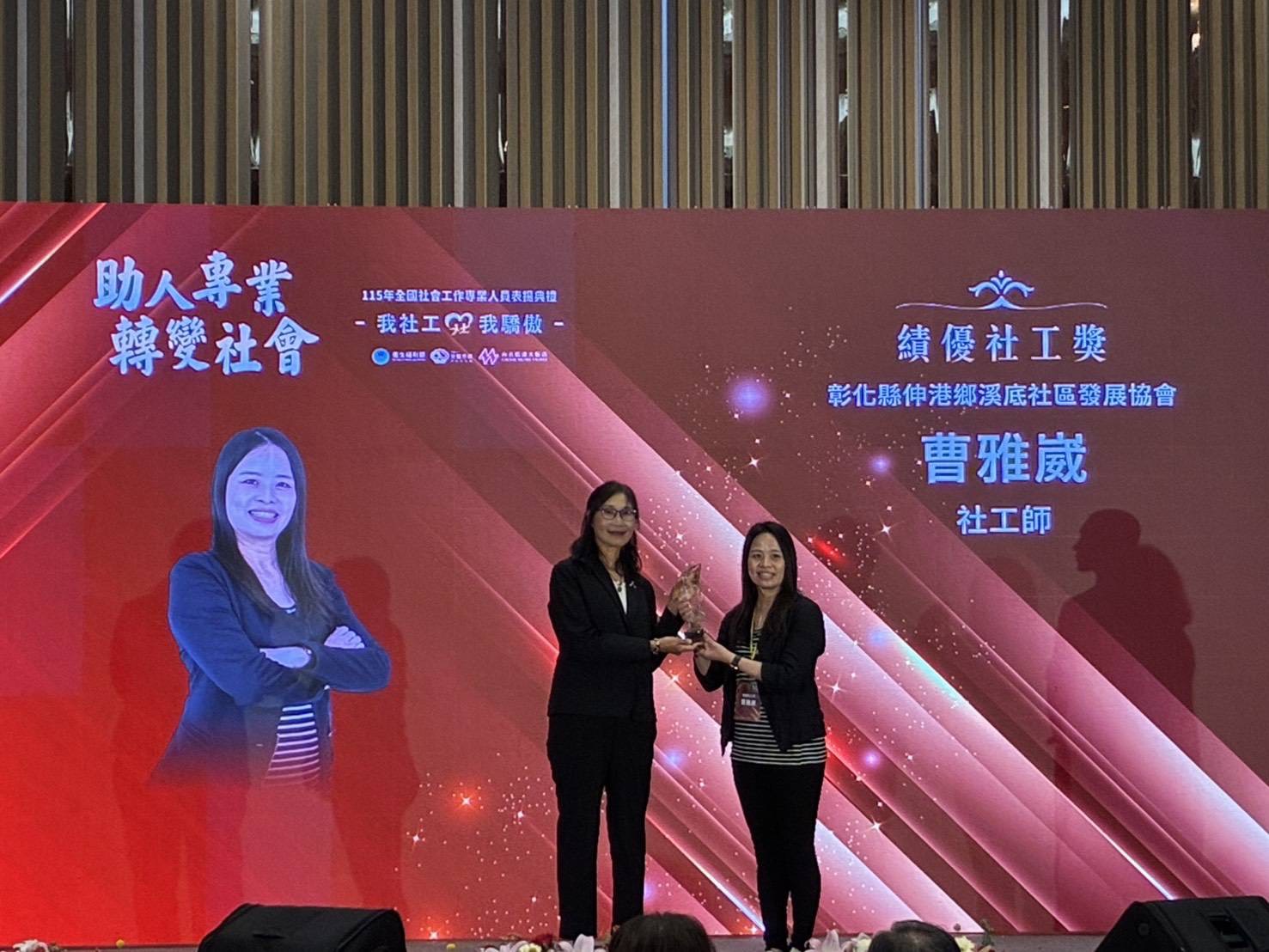 本中心兼任教師曹雅崴老師,榮獲衛生福利部頒發**「115年度全國社會工作專業人員表揚—績優社工獎」**,全體師生同感榮耀!