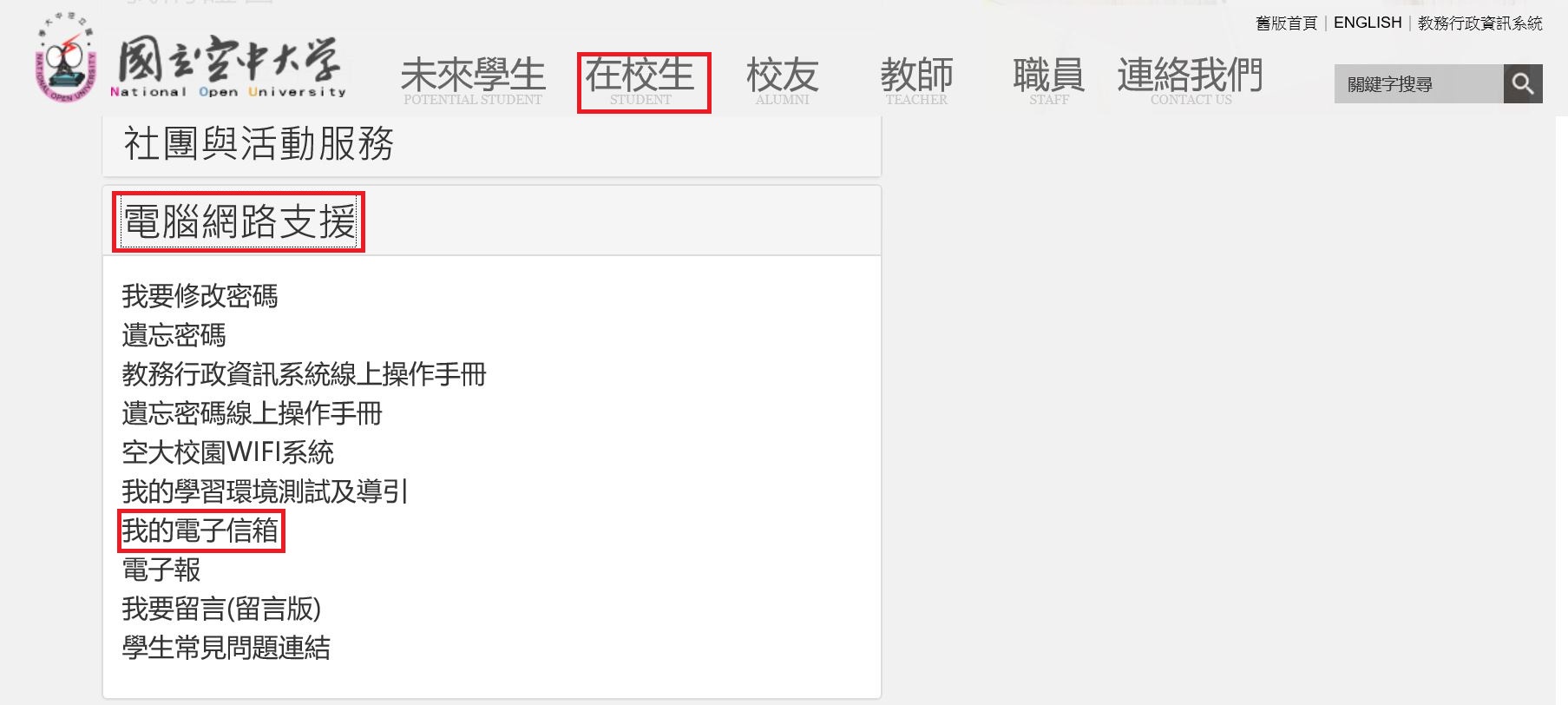 路徑:空大首頁>在校生>電腦網路支援>我的電子信箱